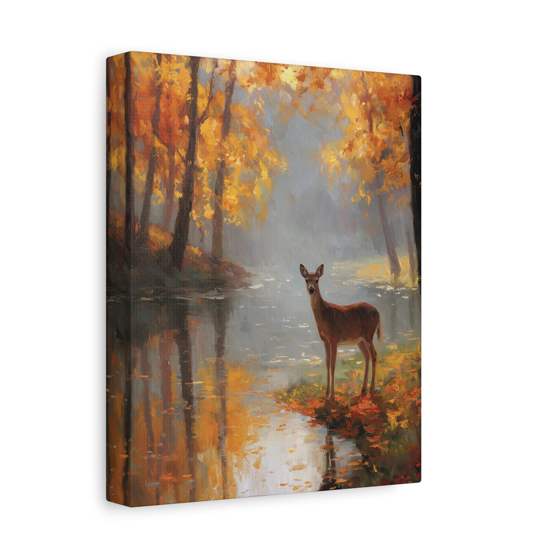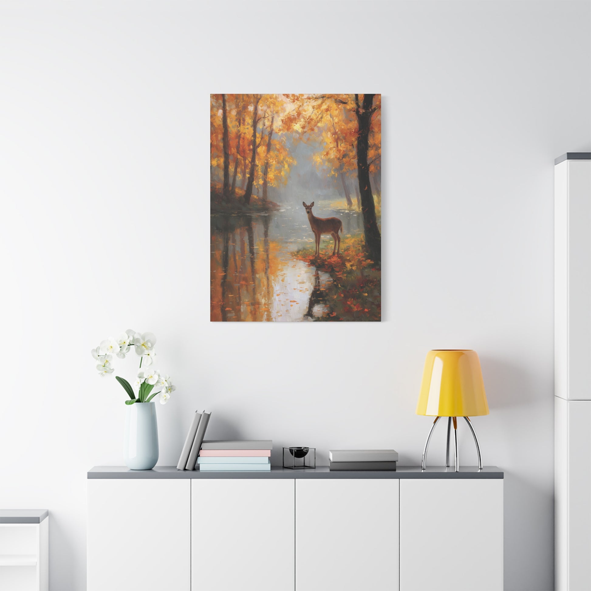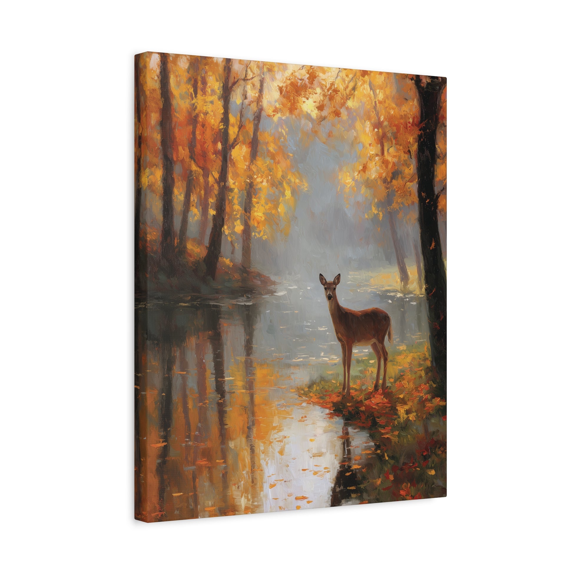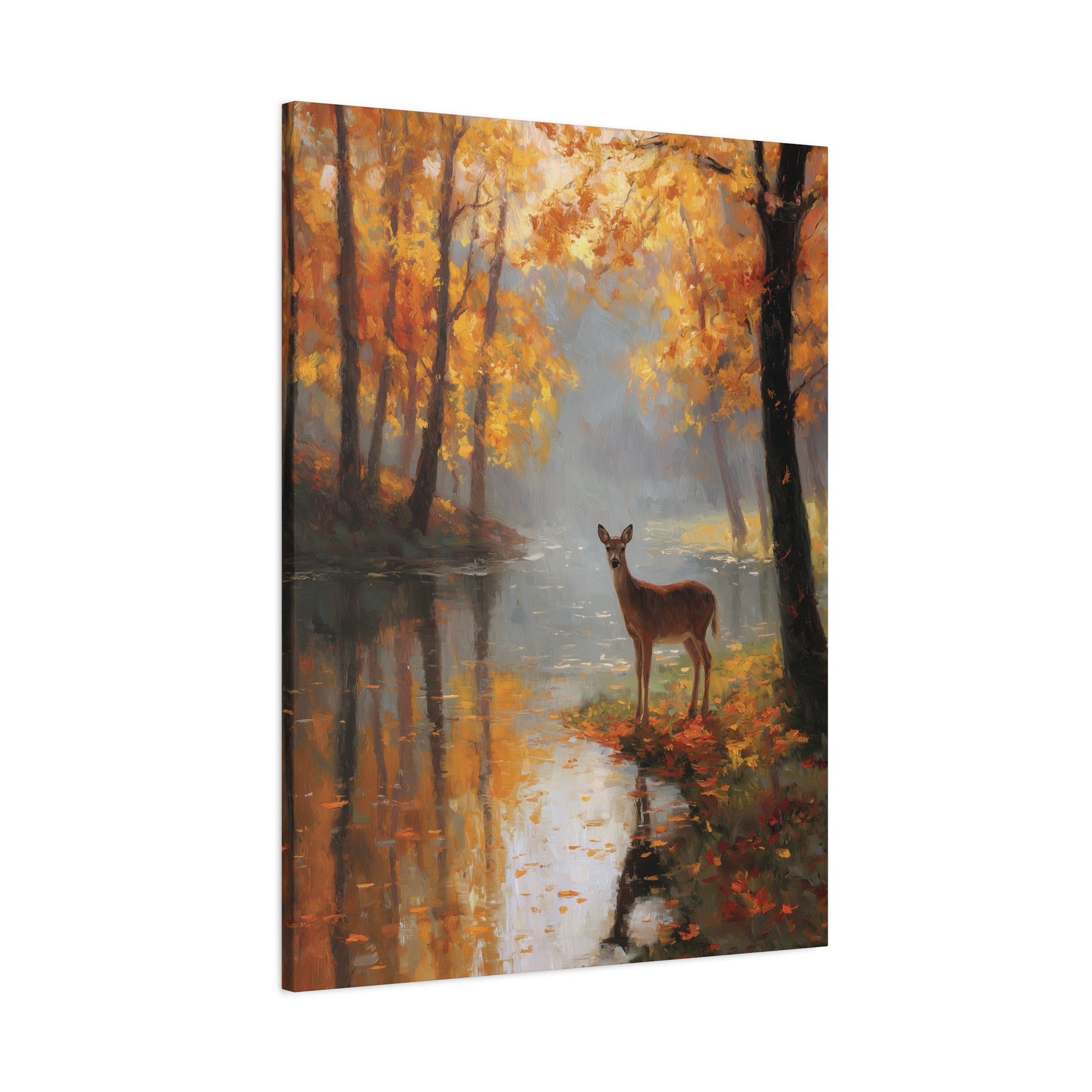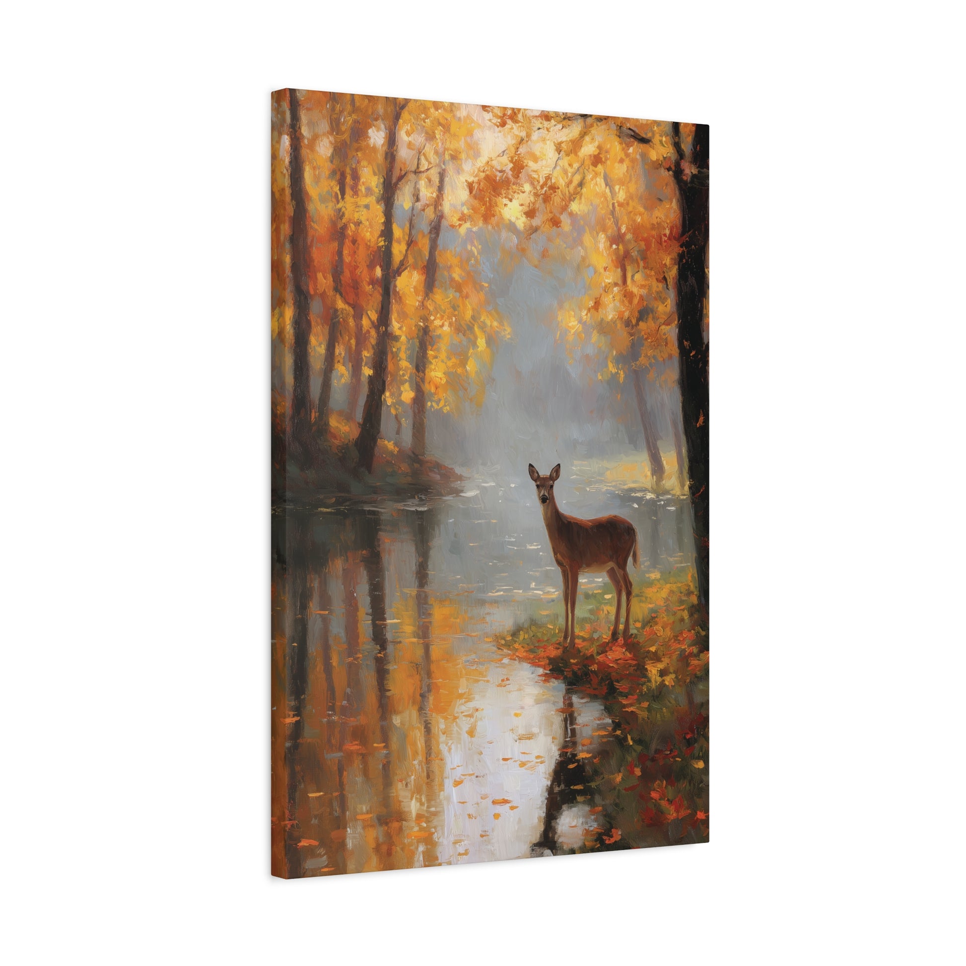 Experience the quiet elegance of autumn with this enchanting canvas art featuring a lone deer standing by a tranquil riverbank surrounded by golden fall foliage. Perfect for cozy home decor, rustic interiors, or nature-inspired spaces, this piece brings warmth and serenity to any wall. A must-have for wildlife and autumn lovers, this art piece evokes a sense of peace and wonder.
