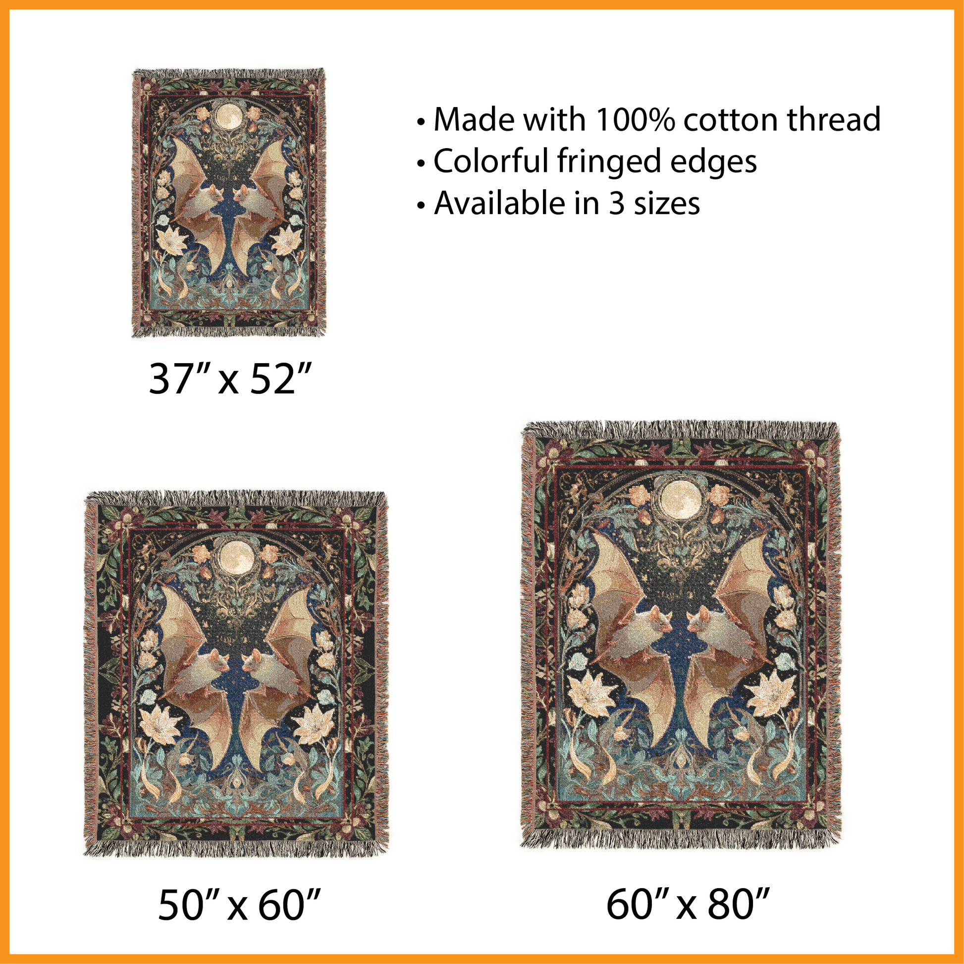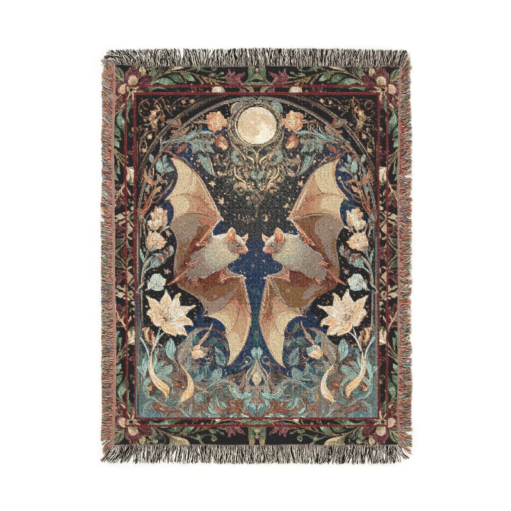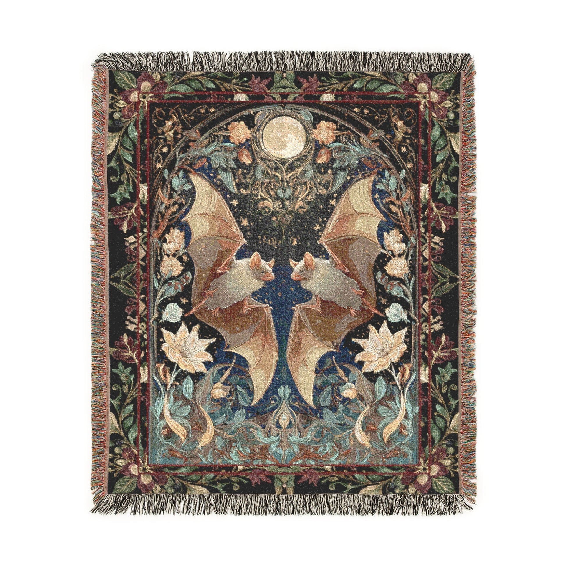 Bat Woven Blanket, Gothic Tapestry, Celestial Wall Hanging, Witchy Moody Botanical Art Jacquard Throw, Dark Academia Whimsigoth Wedding Gift