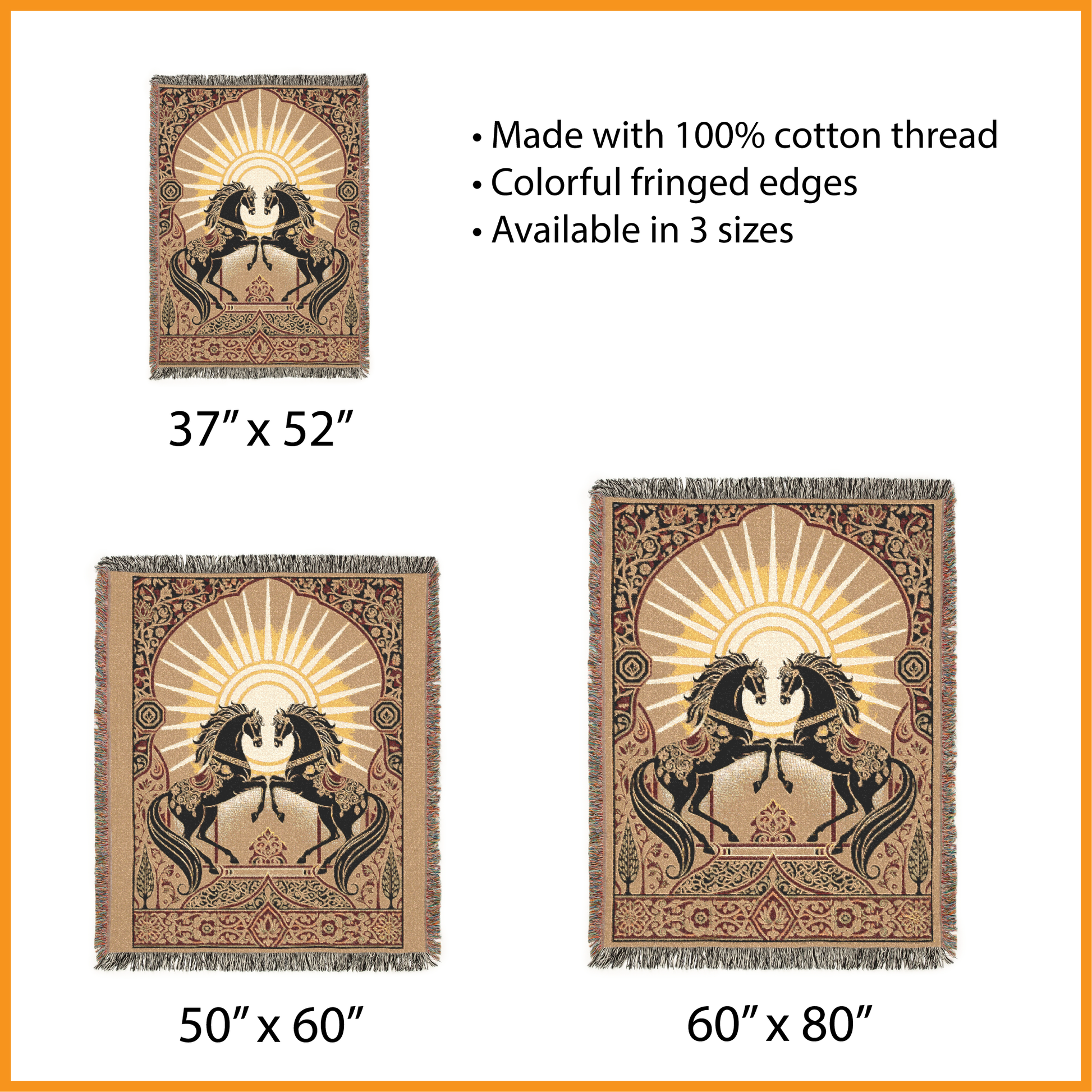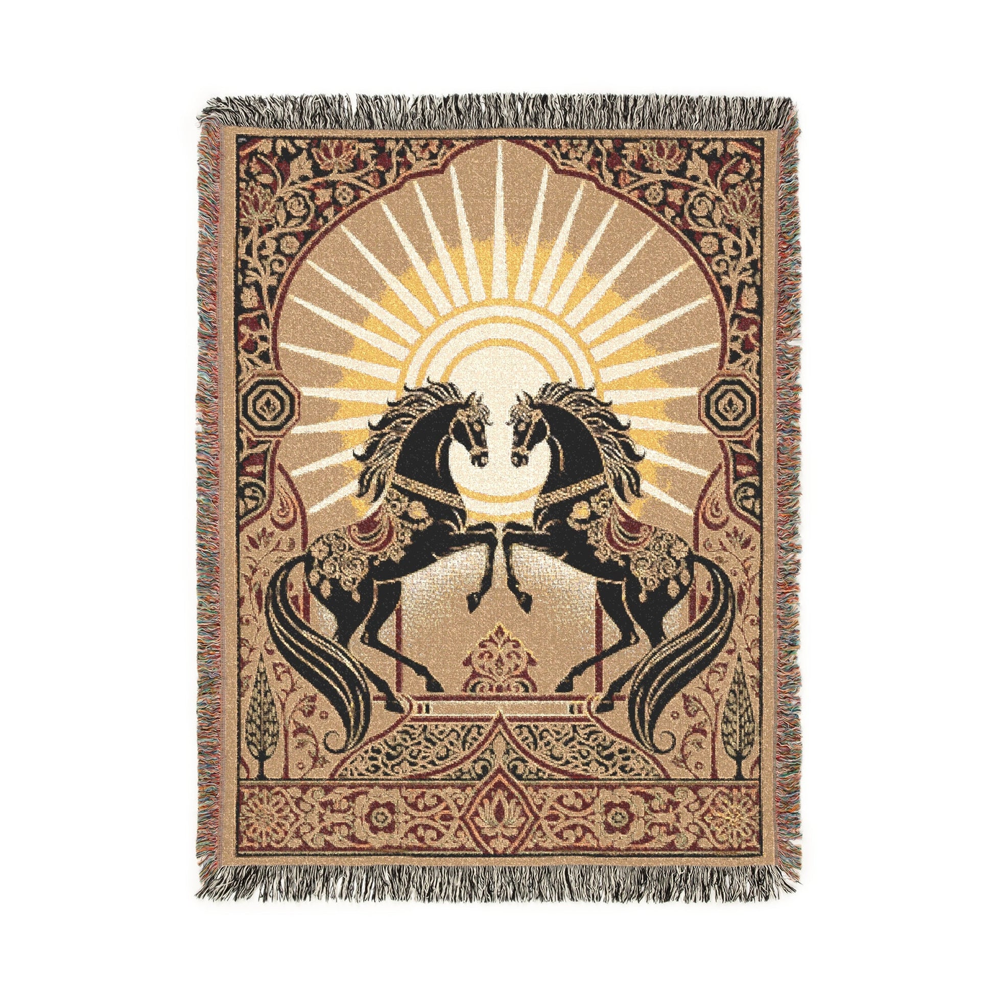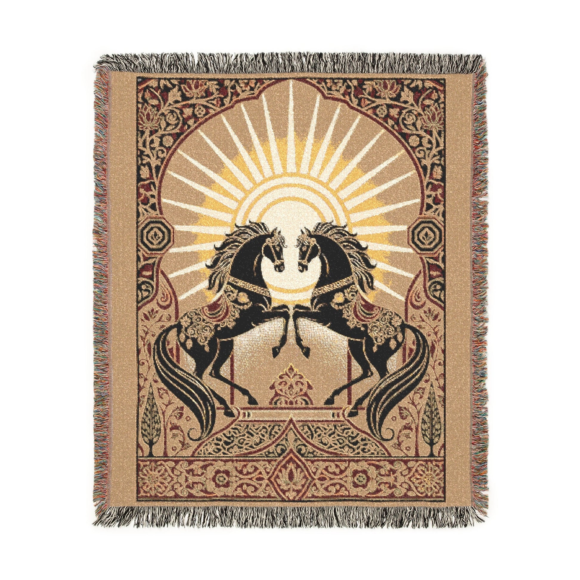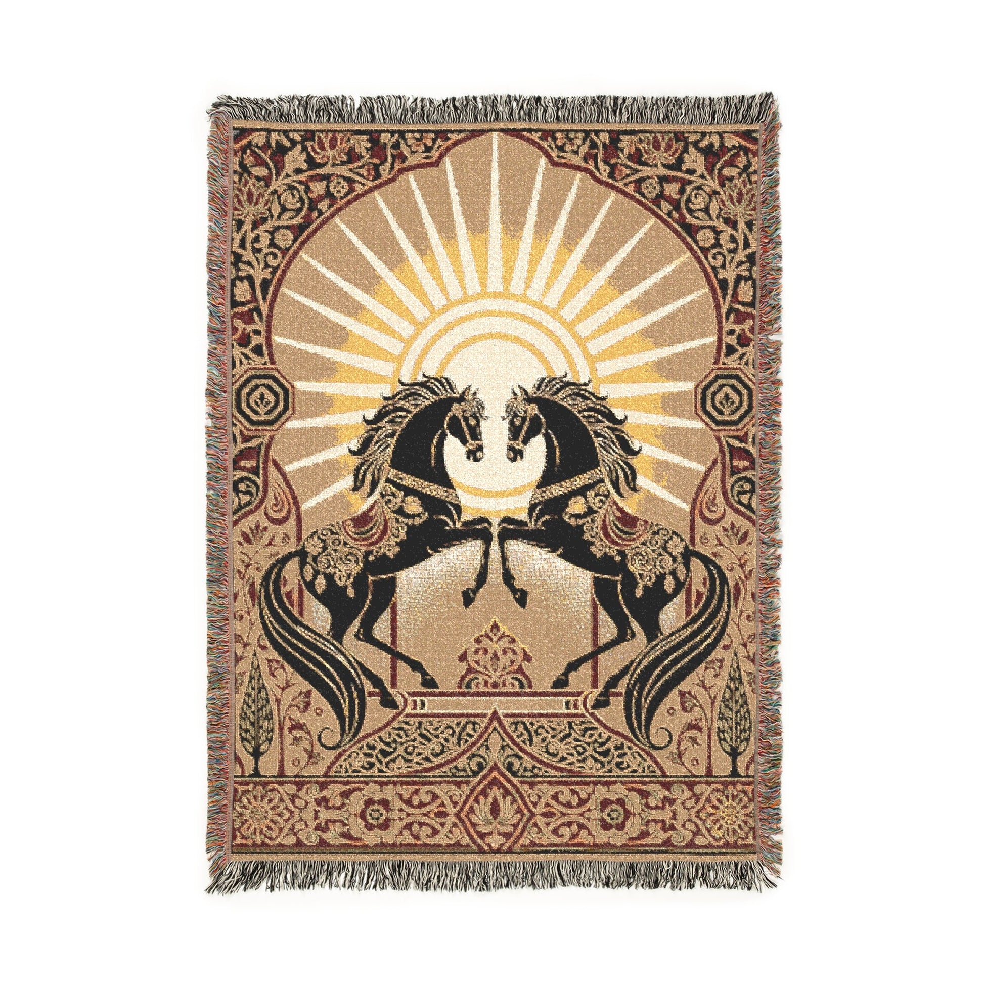 Bohemian Horse Woven Blanket, Celestial Sun Tapestry, Persian Art Jacquard Throw, Maximalist Wall Hanging, Spiritual Equestrian Decor Gift