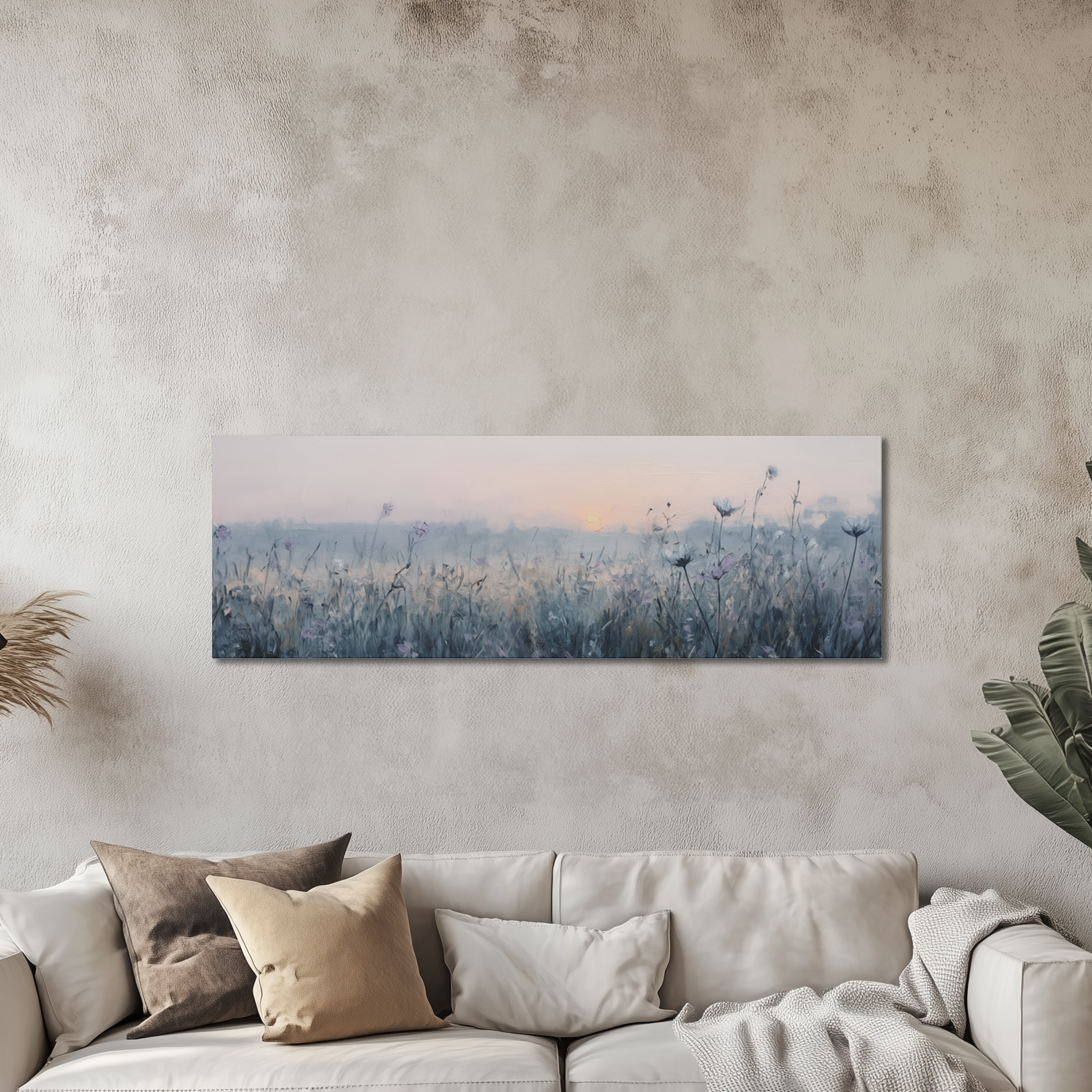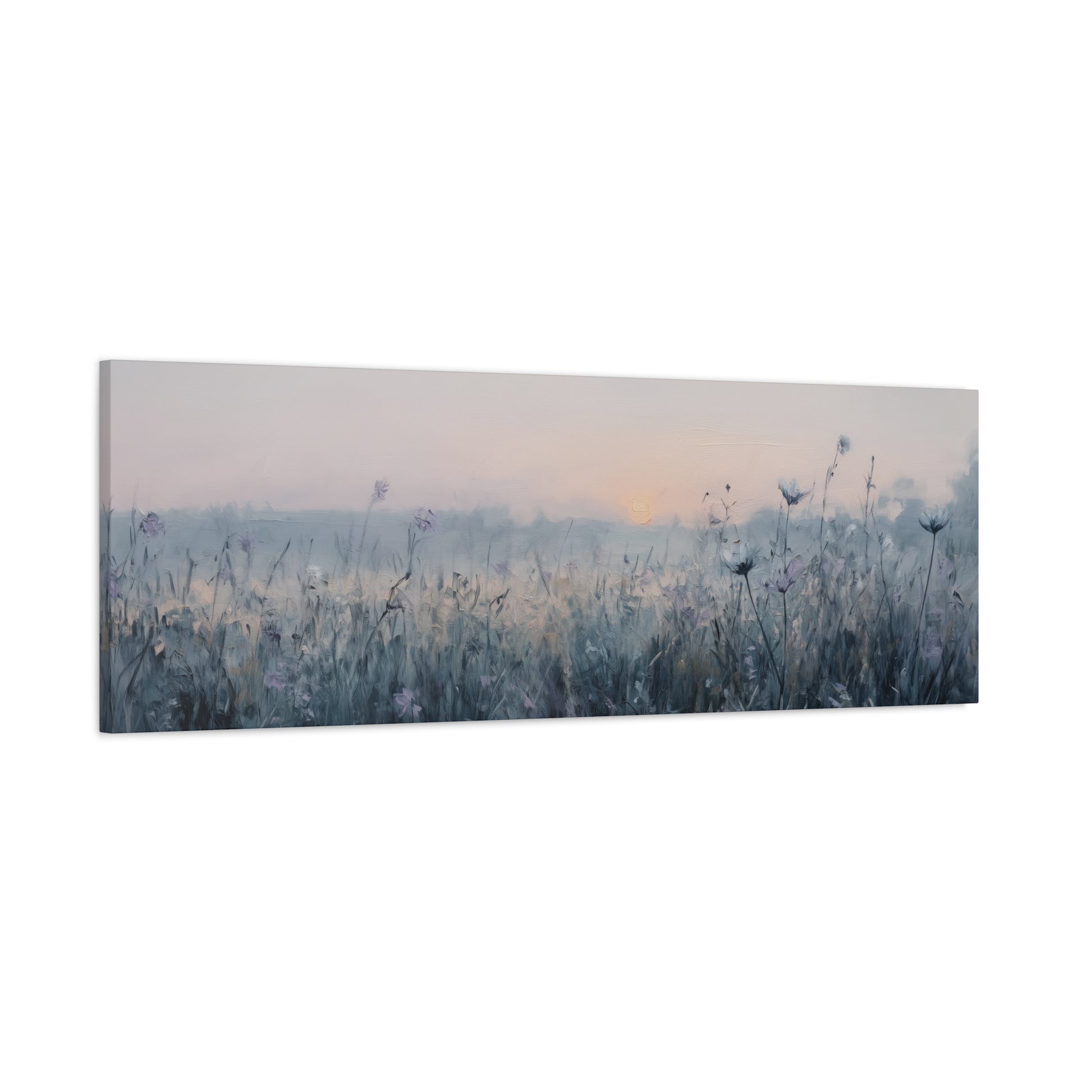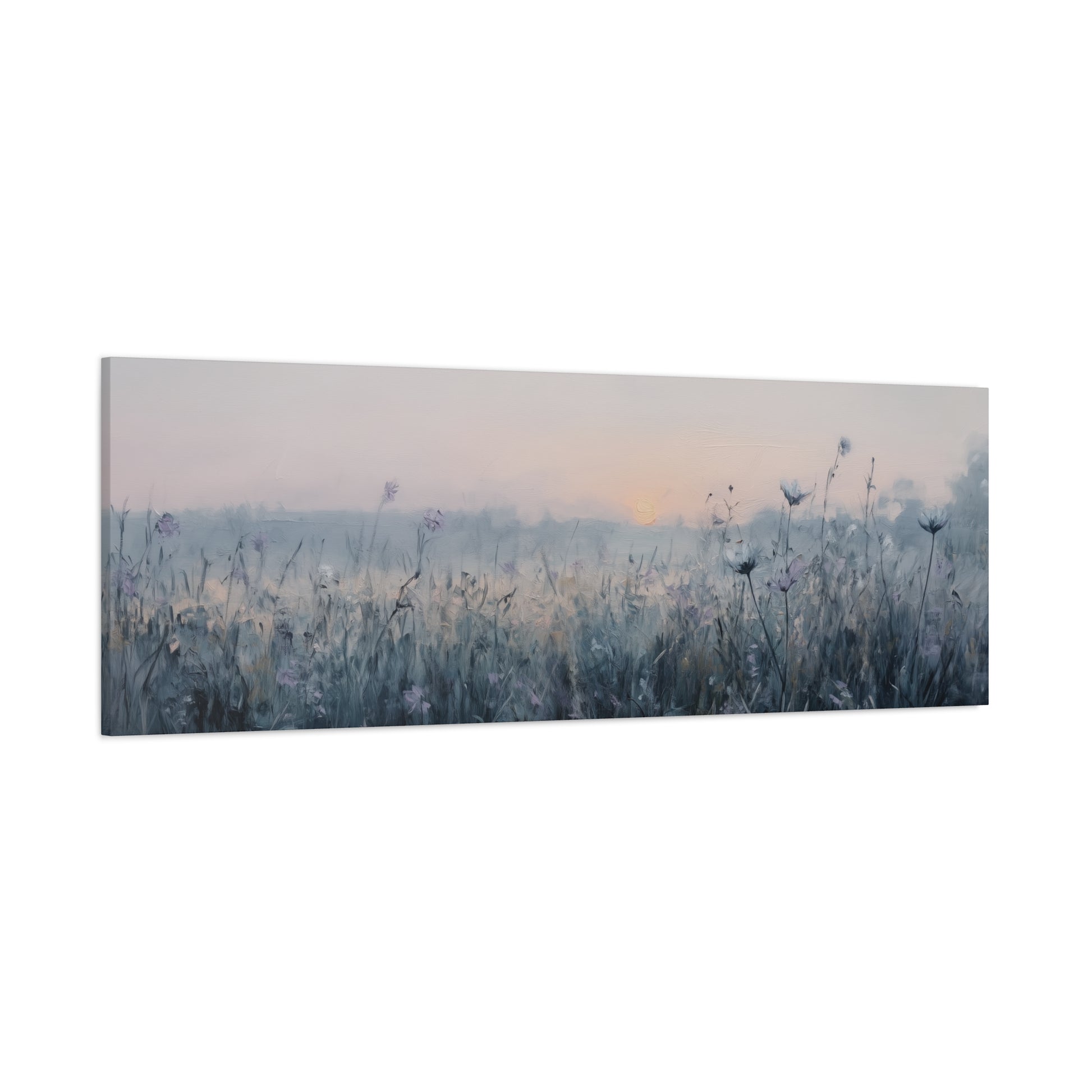 This canvas features a serene oil painting of a botanical field at sunset, rendered in a soft, atmospheric style. The color palette leans towards cool, faded tones, with delicate blues, muted lavenders, and silvery greens blending harmoniously. Expressive brushstrokes add texture and movement, creating a dreamlike, tranquil ambiance. This piece evokes a sense of quiet reflection, making it a perfect addition to a minimalist or nature-inspired space. Ideal for nature lovers, those seeking calm and relaxation, and individuals who appreciate fine art. Perfect for decorating homes, offices, or meditation spaces. Relevant for occasions like birthdays, housewarmings, or as a thoughtful gift for art enthusiasts.