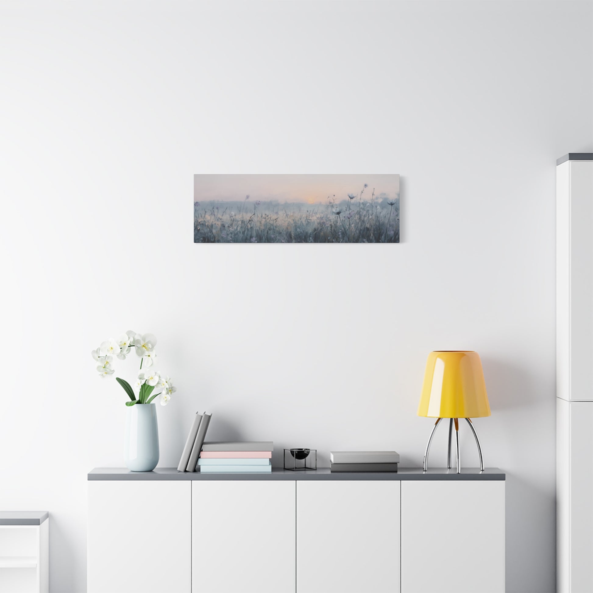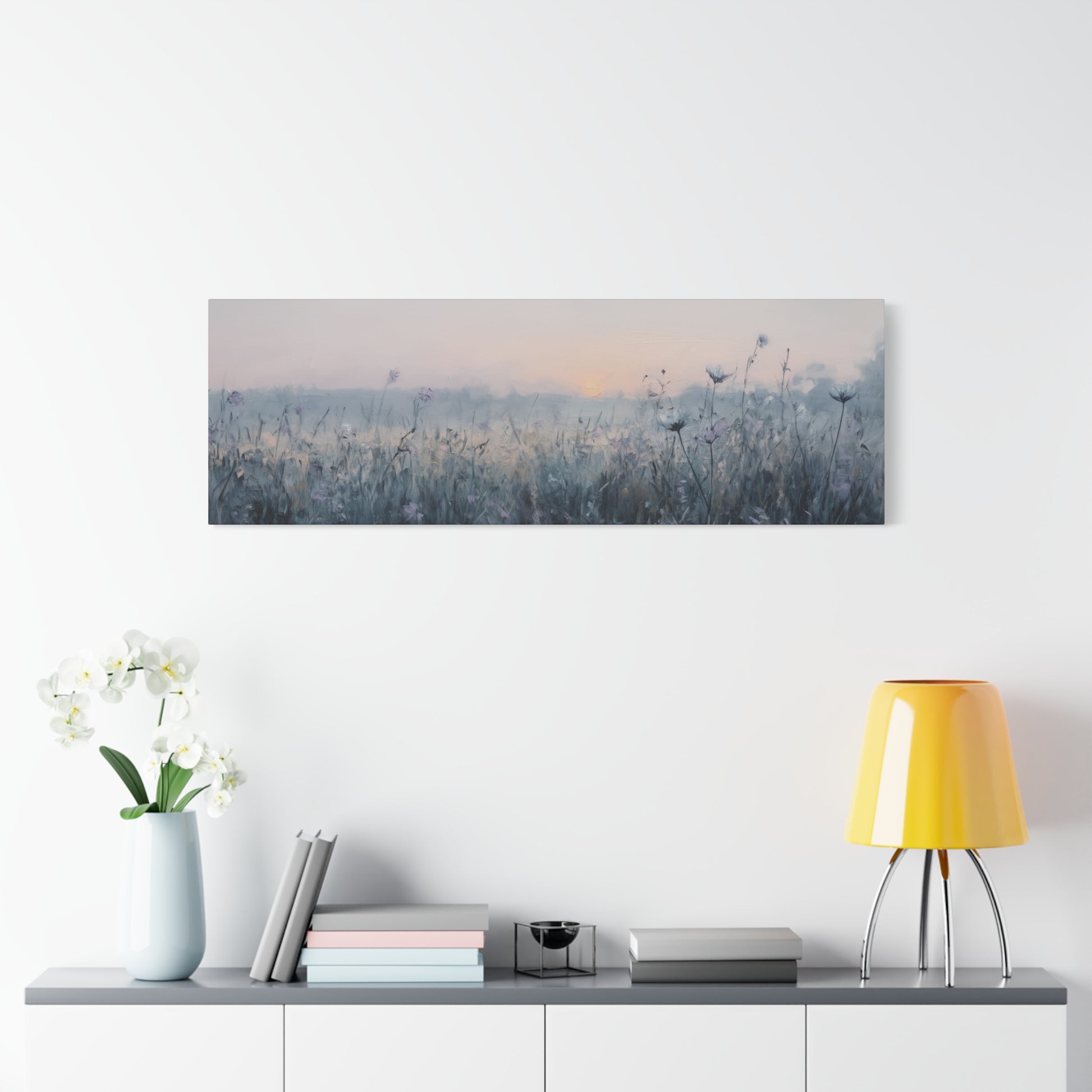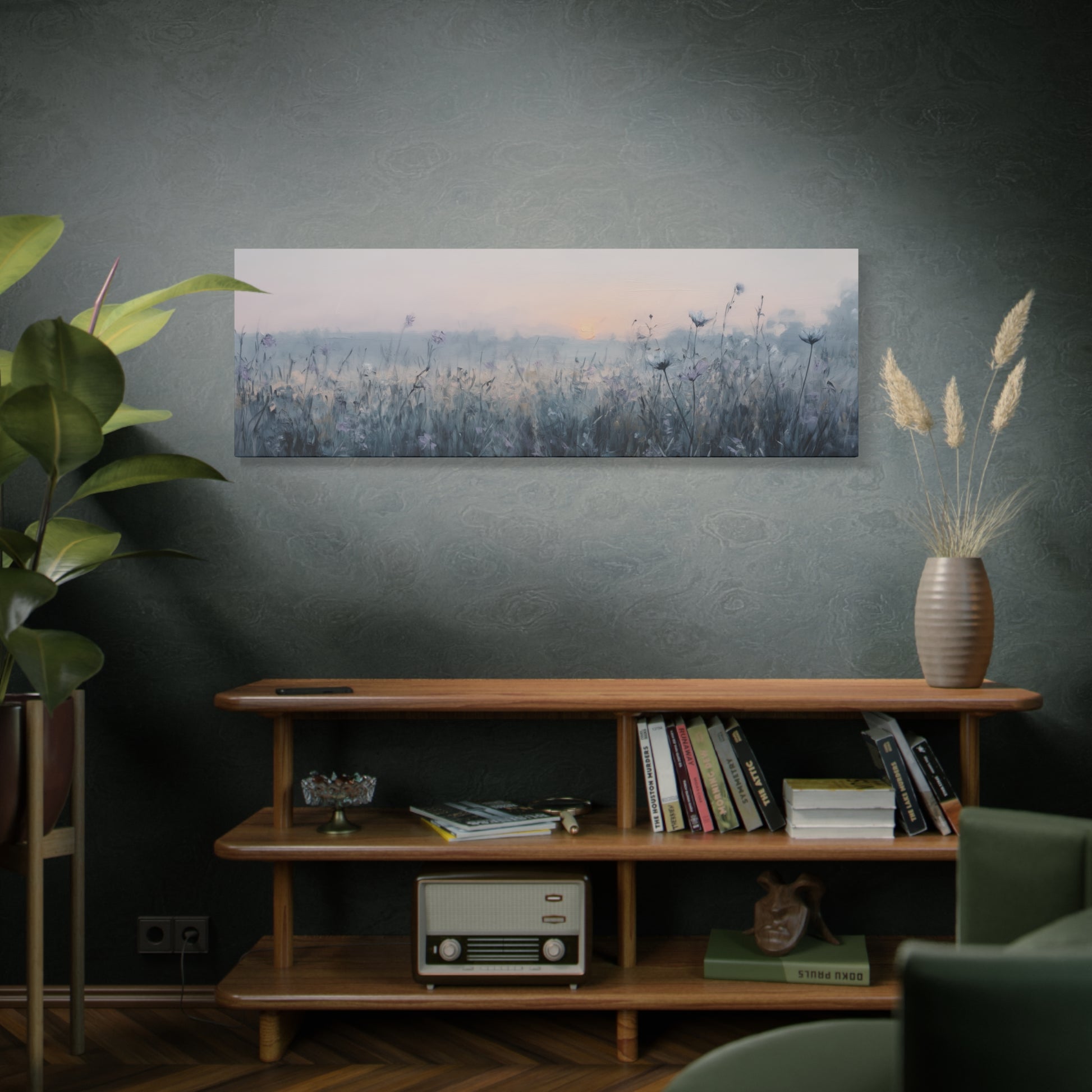 This canvas features a serene oil painting of a botanical field at sunset, rendered in a soft, atmospheric style. The color palette leans towards cool, faded tones, with delicate blues, muted lavenders, and silvery greens blending harmoniously. Expressive brushstrokes add texture and movement, creating a dreamlike, tranquil ambiance. This piece evokes a sense of quiet reflection, making it a perfect addition to a minimalist or nature-inspired space. Ideal for nature lovers, those seeking calm and relaxation, and individuals who appreciate fine art. Perfect for decorating homes, offices, or meditation spaces. Relevant for occasions like birthdays, housewarmings, or as a thoughtful gift for art enthusiasts.