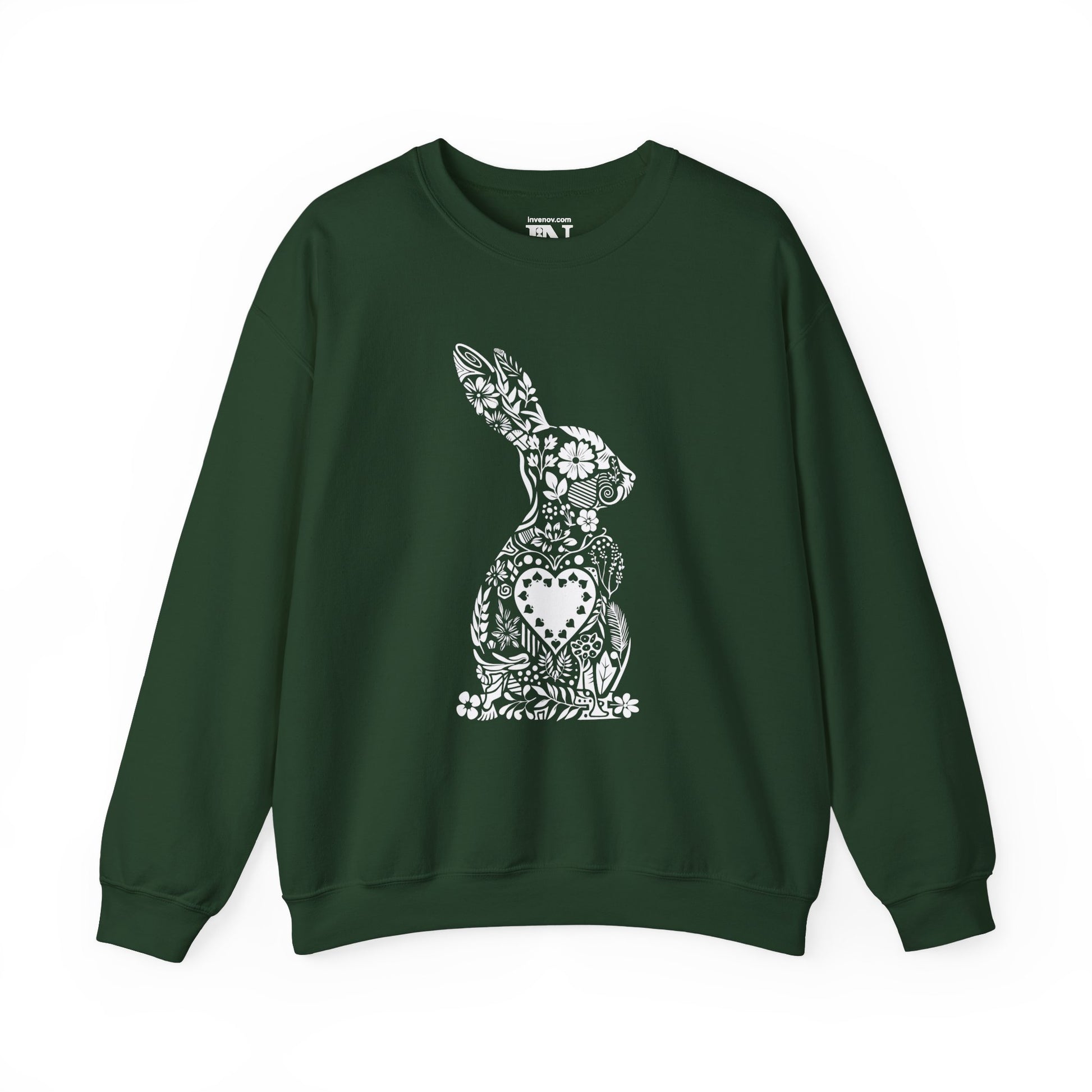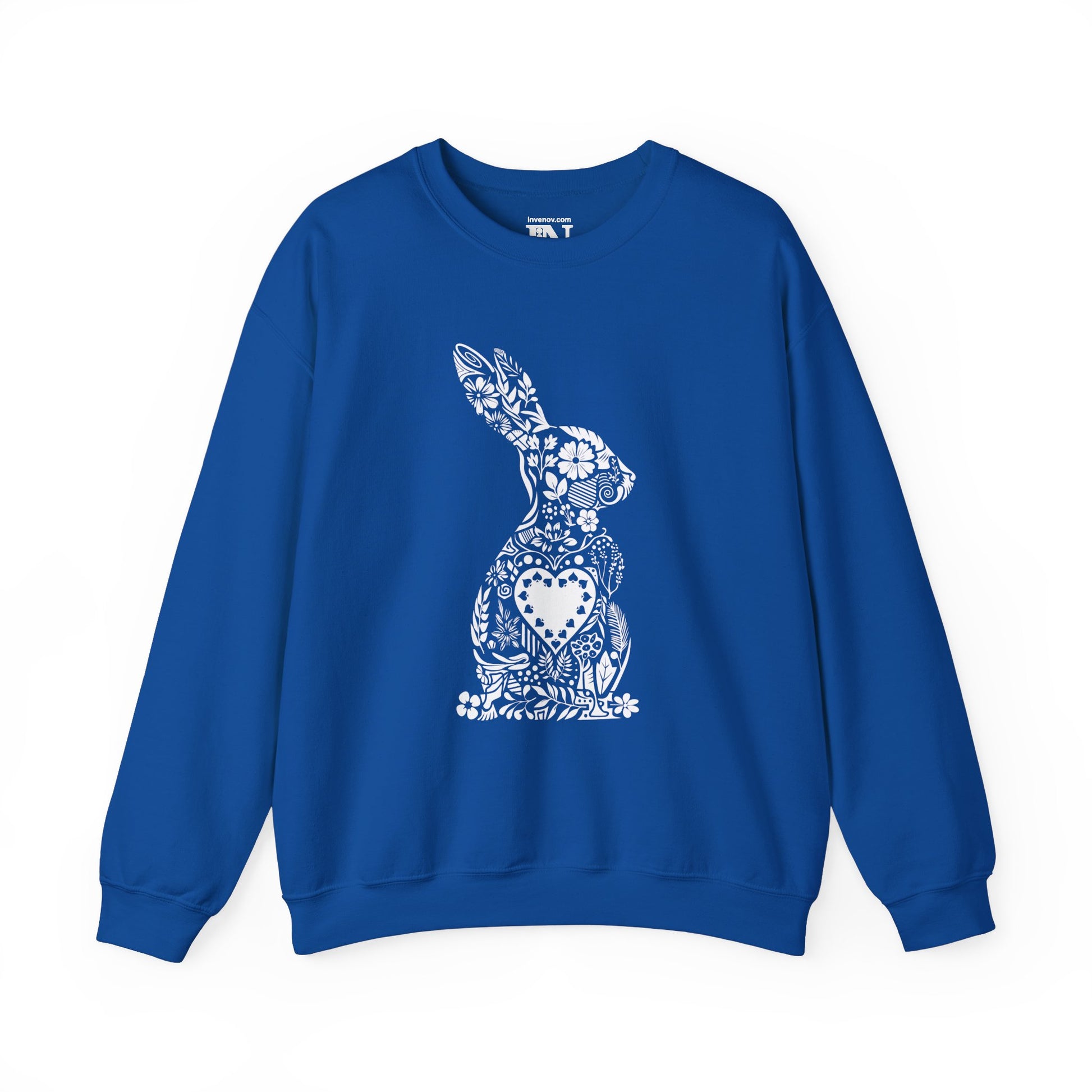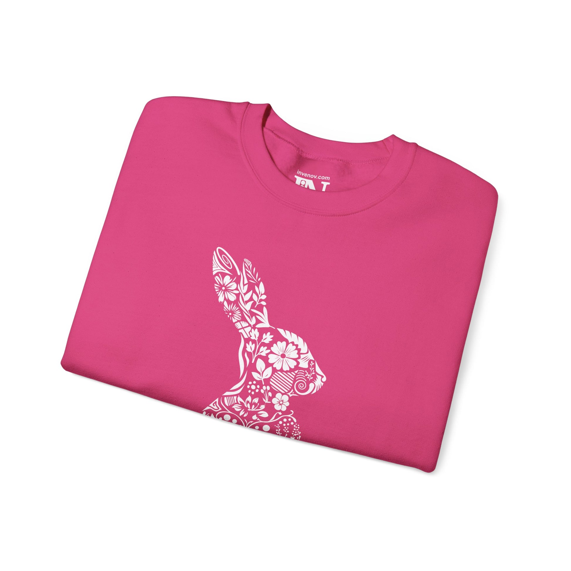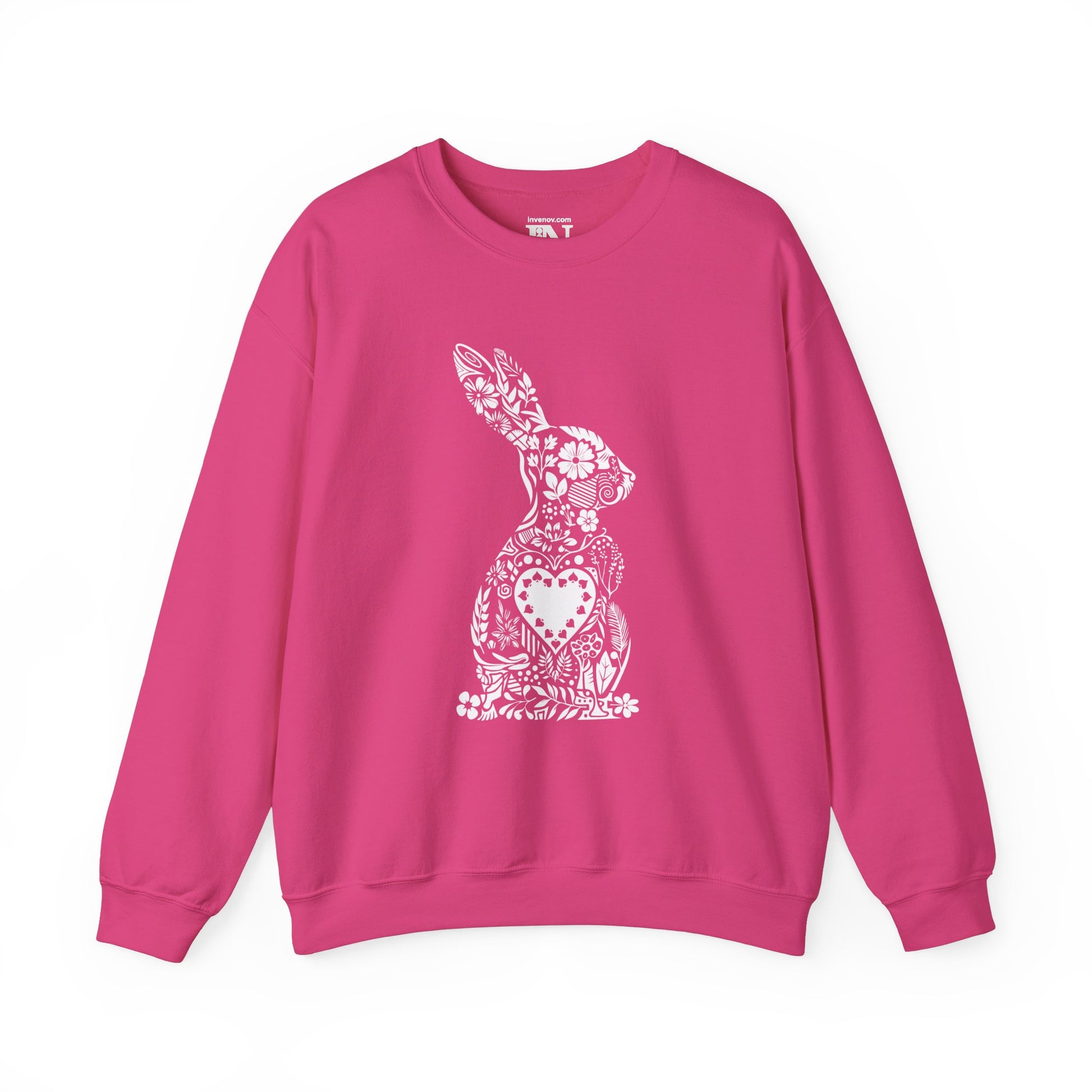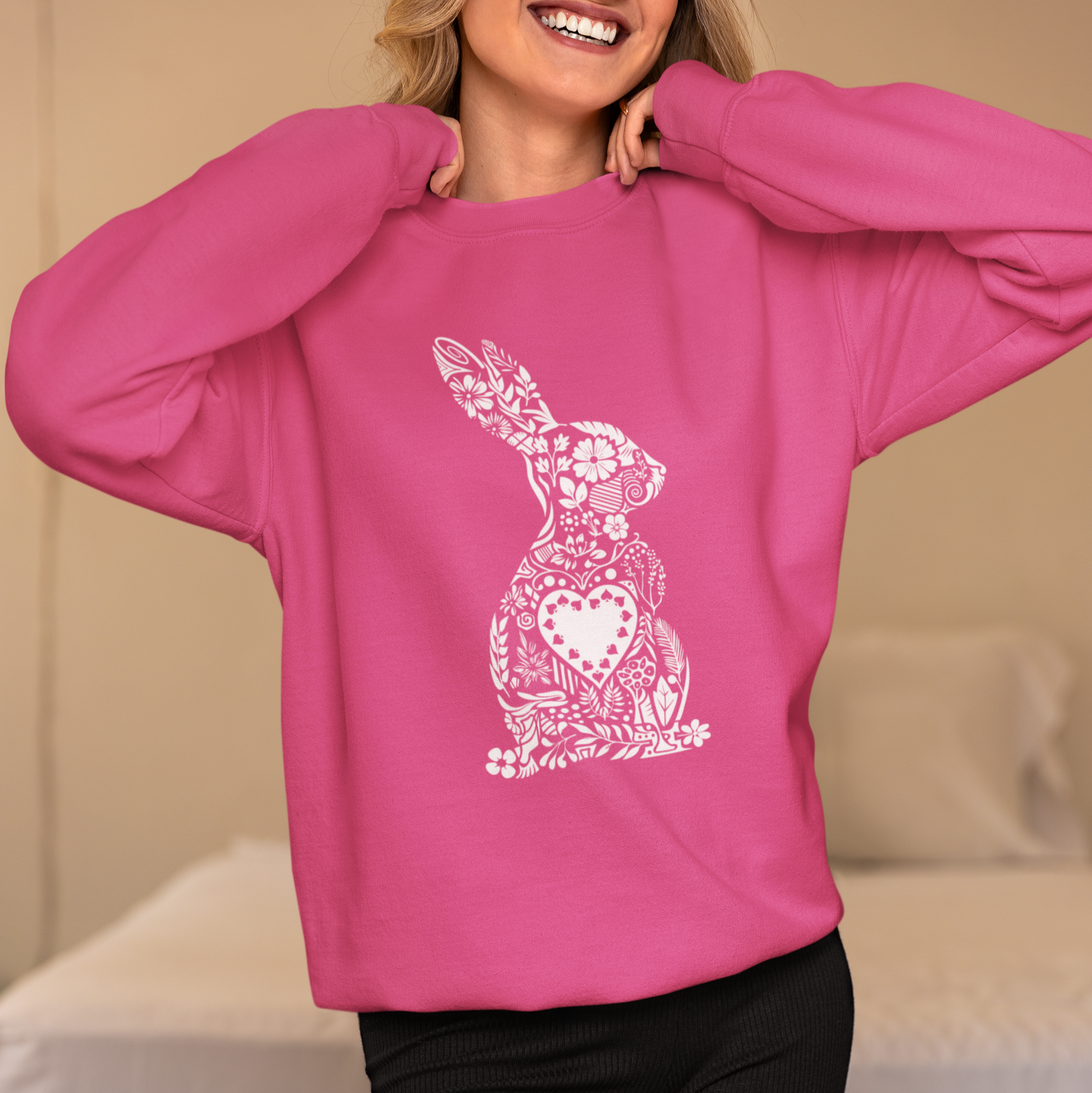 This vibrant sweatshirt features a decorative silhouette of a bunny intricately crafted with floral and botanical patterns, including a central heart motif. The design is printed in white, creating a striking contrast against the background. Perfect for springtime, Easter celebrations, or anyone who loves playful and nature-inspired fashion. Its cozy fabric and relaxed fit make it a stylish and comfortable addition to casual wear, giving off a whimsical and artistic vibe. Ideal for adults who appreciate unique and colorful clothing choices.