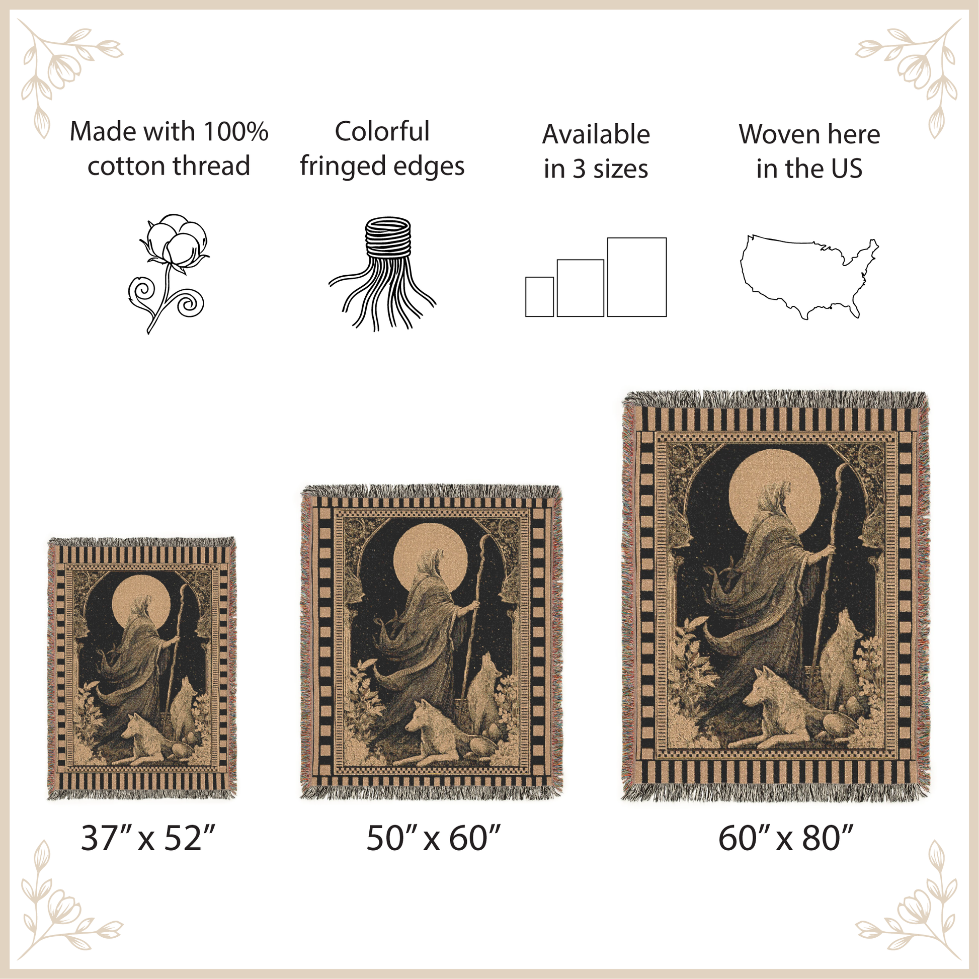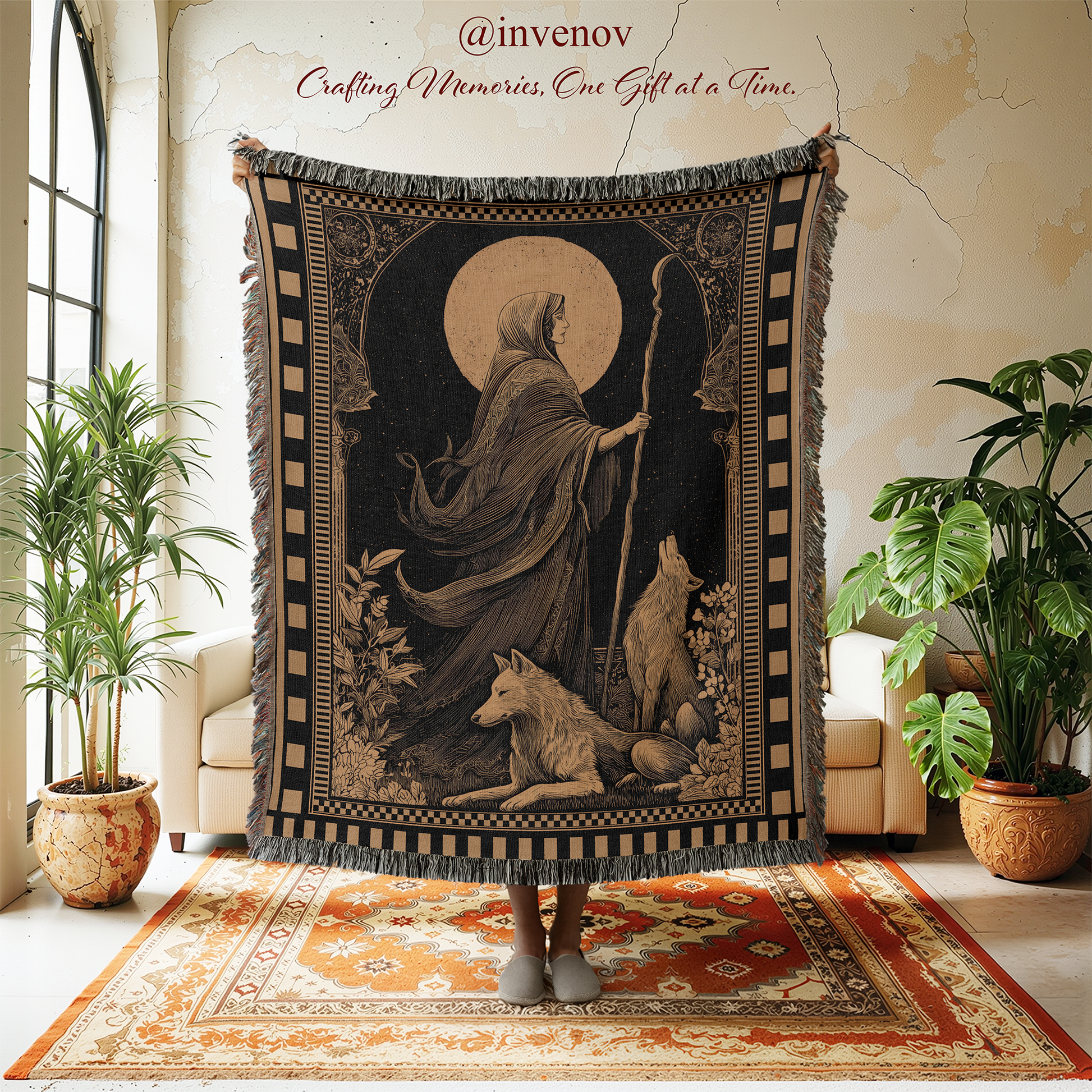 Celestial Moon Goddess Woven Blanket, Tarot Style Dark Tapestry, Wolf Spirit Animal Throw, Dark Academia Witchy Decor, Occult Art Gift