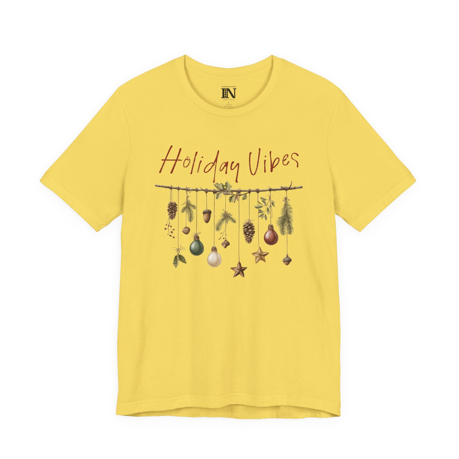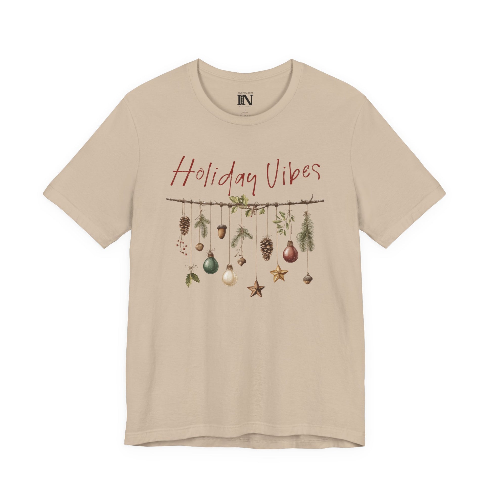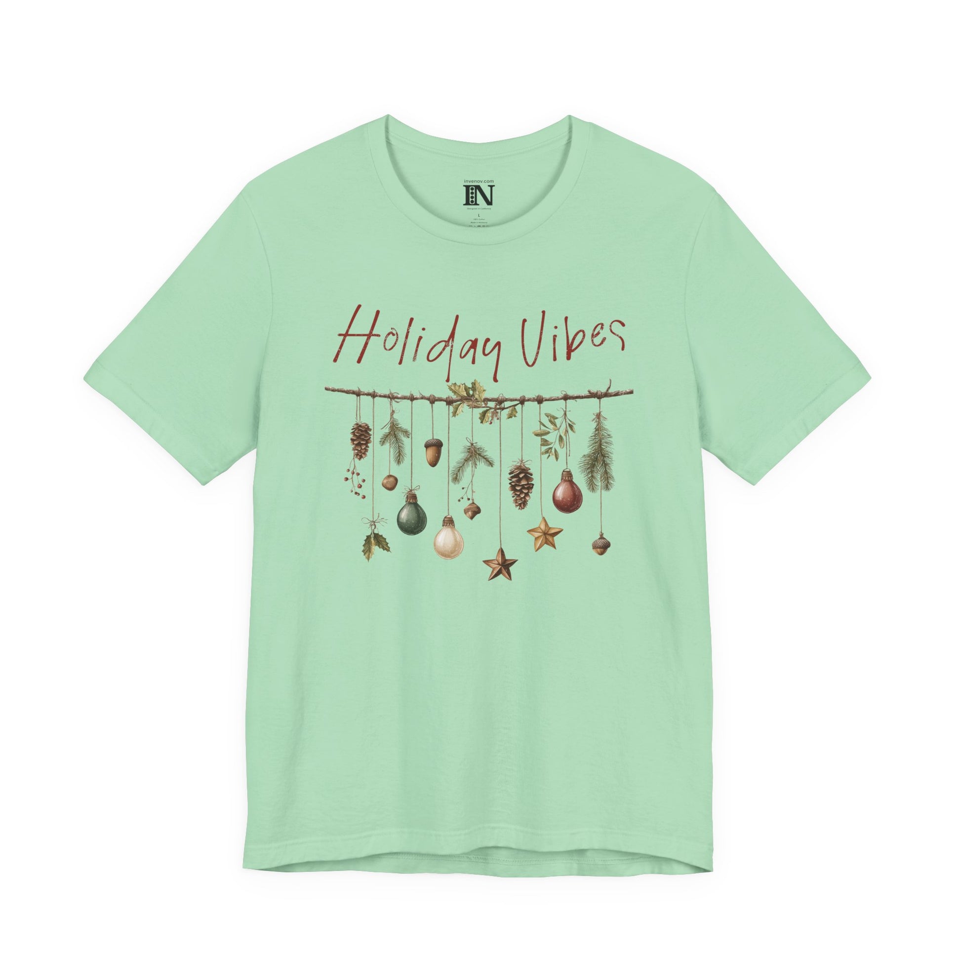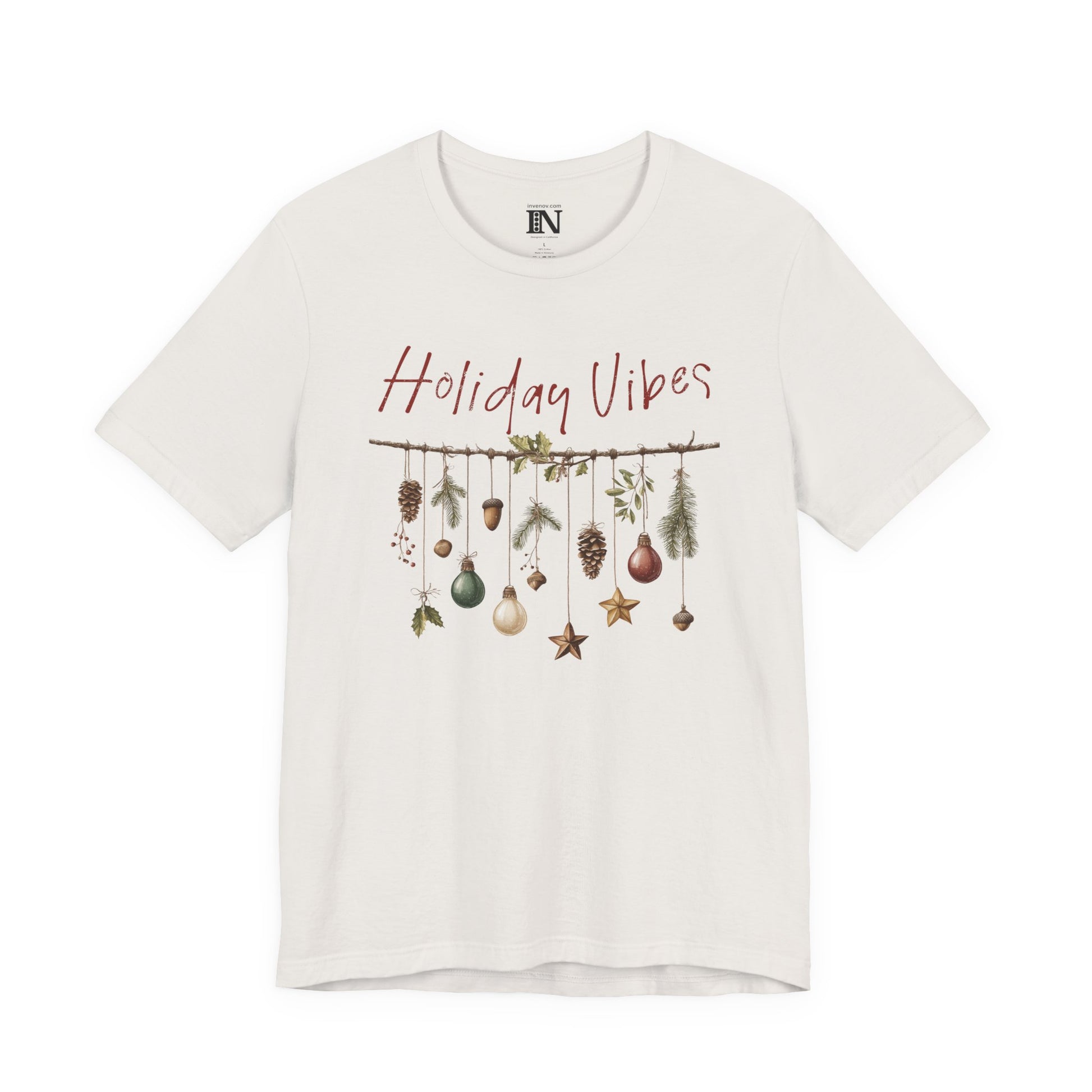 This festive t-shirt brings cozy holiday charm with a rustic woodland design. The soft cotton tee features the hand-lettered phrase “Holiday Vibes” in a cheerful red script above a branch adorned with dangling ornaments—pinecones, stars, and greenery for a natural Christmas look. Perfect for casual gatherings, gift giving, or spreading seasonal cheer, it’s a comfortable and stylish piece for winter celebrations and everyday wear during the holidays. Ideal for adults looking for a festive and cozy holiday wardrobe addition.
