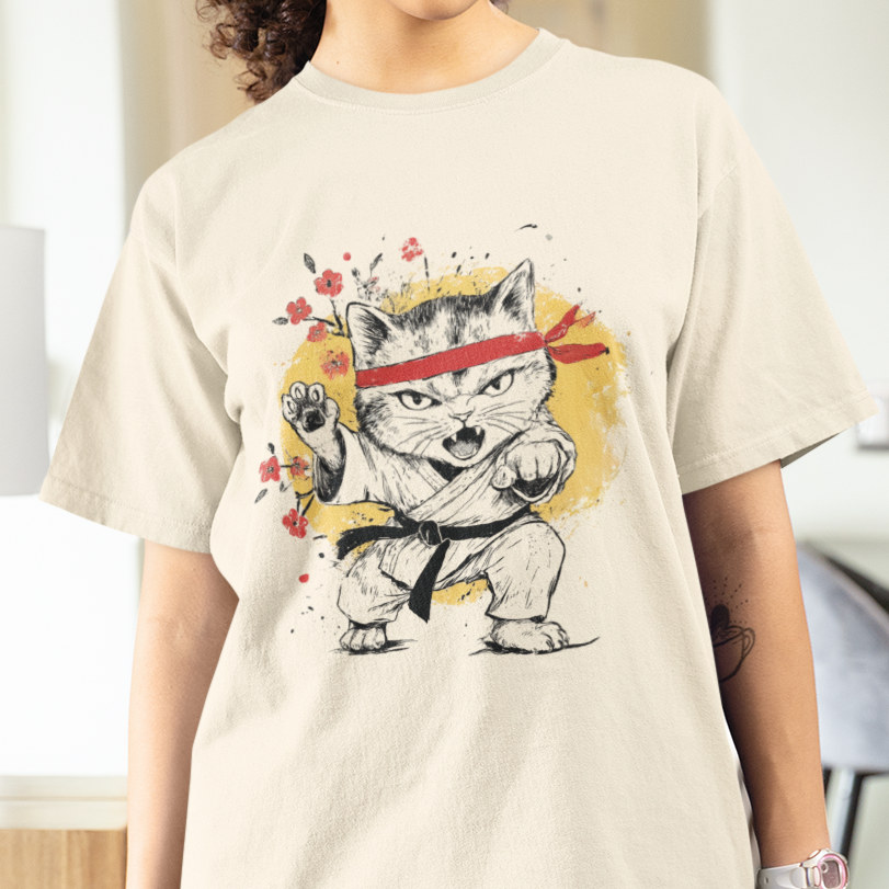 Unleash your inner warrior with this Karate Cat Martial Arts T-Shirt, featuring an adorable yet fierce feline dressed in a karate gi with a black belt, ready to strike. This playful and artistic design showcases a sketched-style cat with intense eyes, a determined stance, and a bold red headband, embodying the spirit of a true martial artist. The background features a textured golden circle with delicate cherry blossoms, adding a touch of Japanese-inspired aesthetics. Perfect for martial arts enthusiasts, cat lovers, and those who enjoy unique, fun apparel, this lightweight and comfortable tee makes a great casual wear statement piece or a fantastic gift for someone who loves karate, judo, or kung fu.