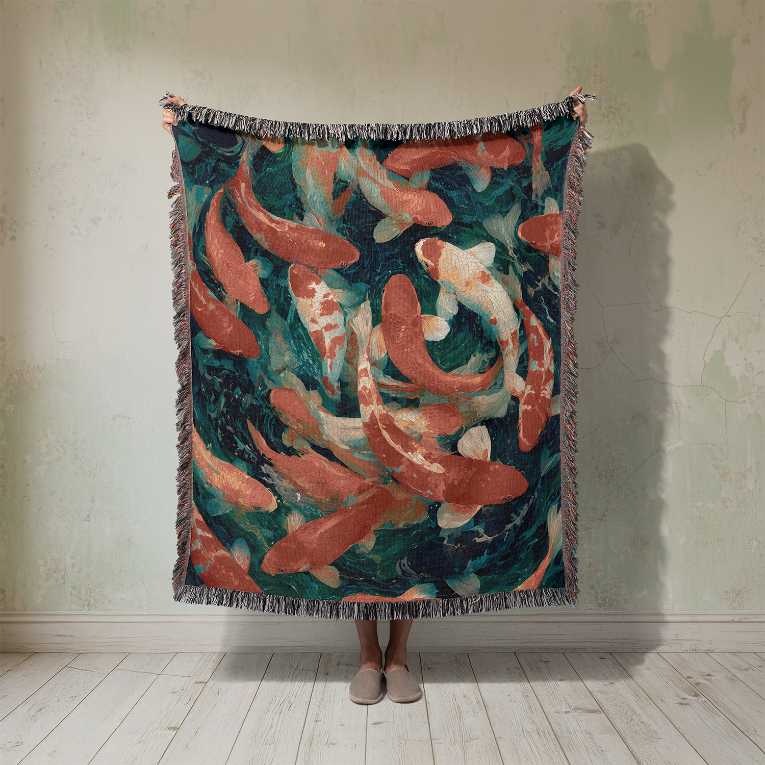 Koi Fish Woven Blanket, Japanese Art Tapestry, Maximalist Decor Throw, Chinoiserie Pond Life Jacquard, Coastal Decor Spiritual Gift