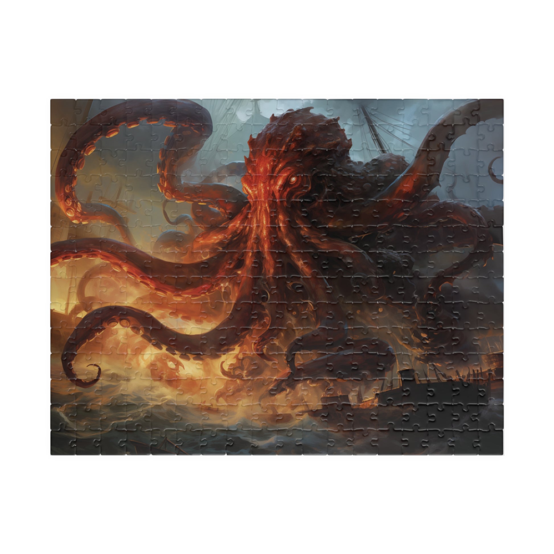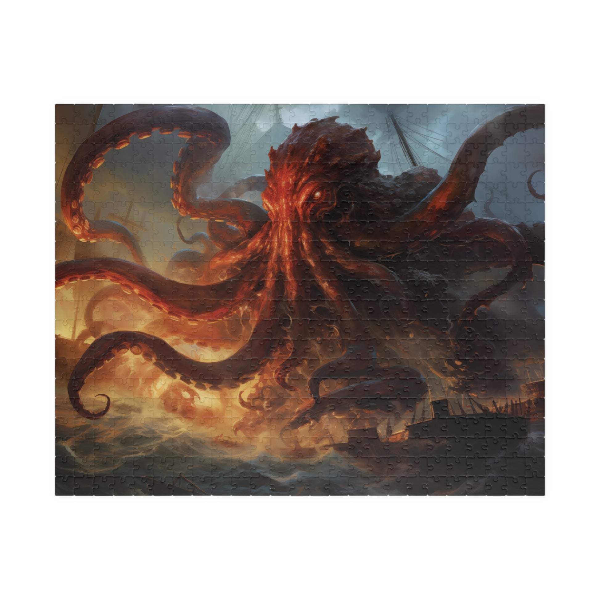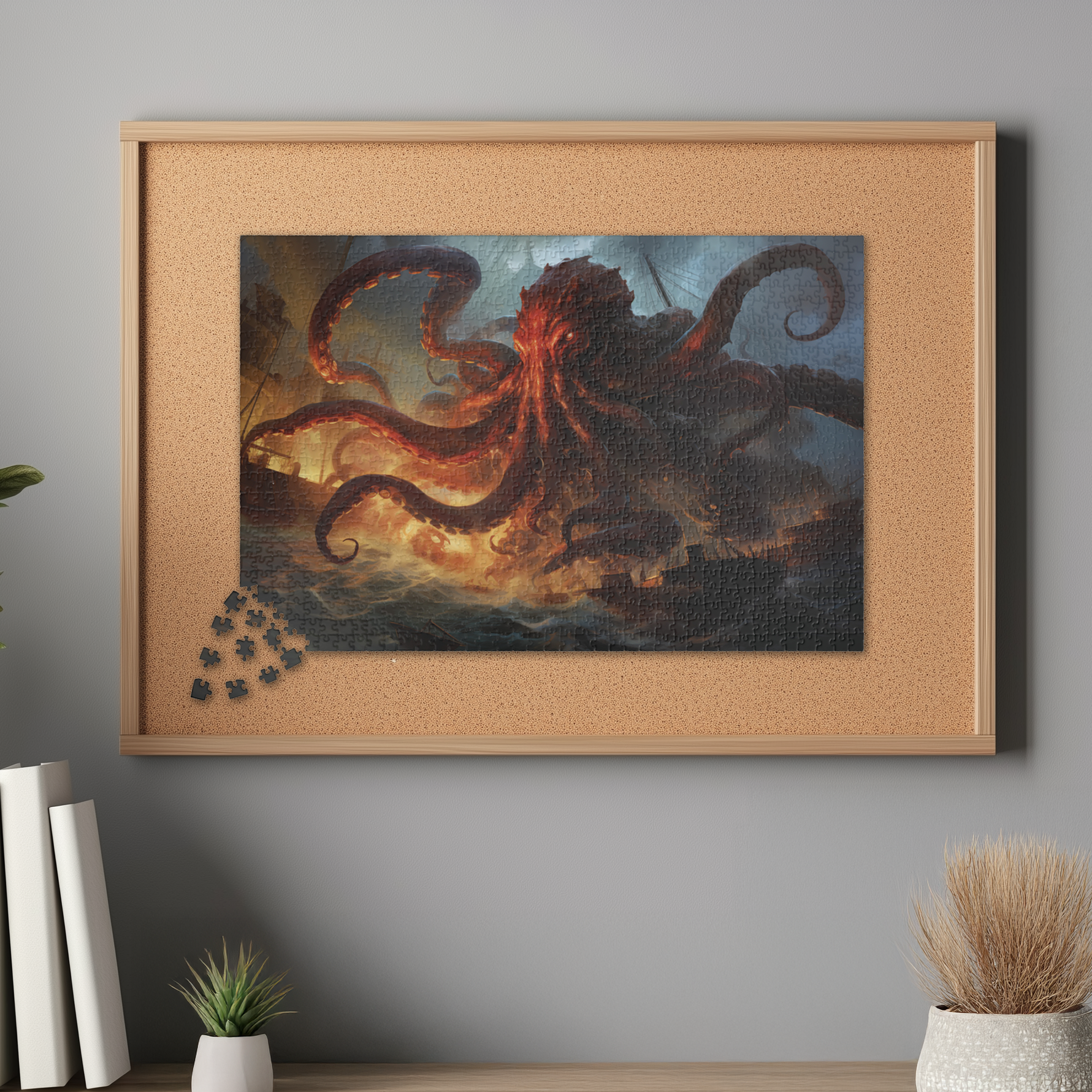 Unleash the kraken—one piece at a time! This dramatic jigsaw puzzle features an epic fantasy scene of a fiery, colossal sea monster rising from the ocean depths, its massive tentacles engulfing a burning ship under a stormy sky. With rich, high-contrast details and cinematic lighting, this puzzle is perfect for lovers of fantasy, mythology, and nautical adventures. Whether you’re a puzzle enthusiast or looking for a bold gift, this high-quality puzzle provides hours of immersive fun and a striking final image worth framing.