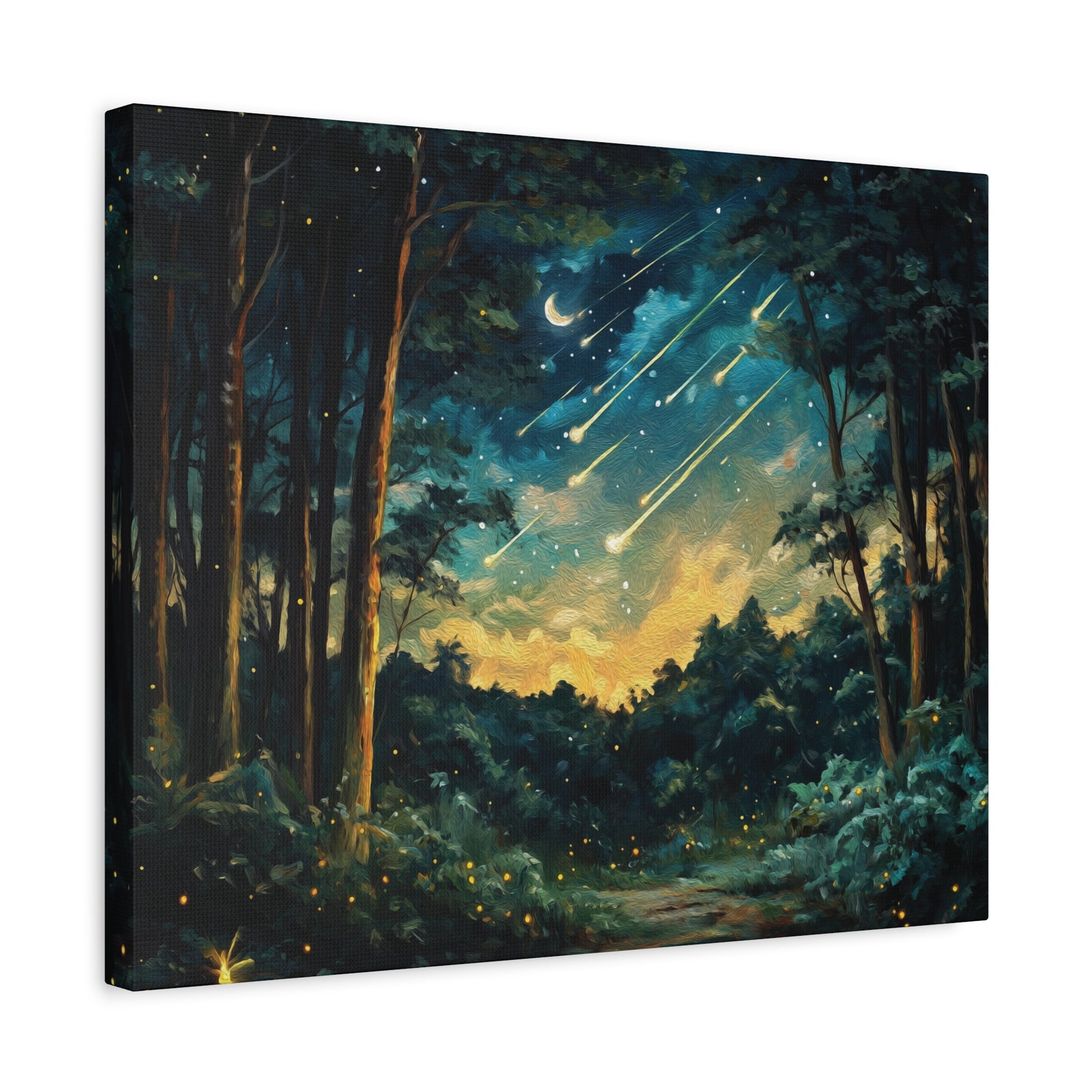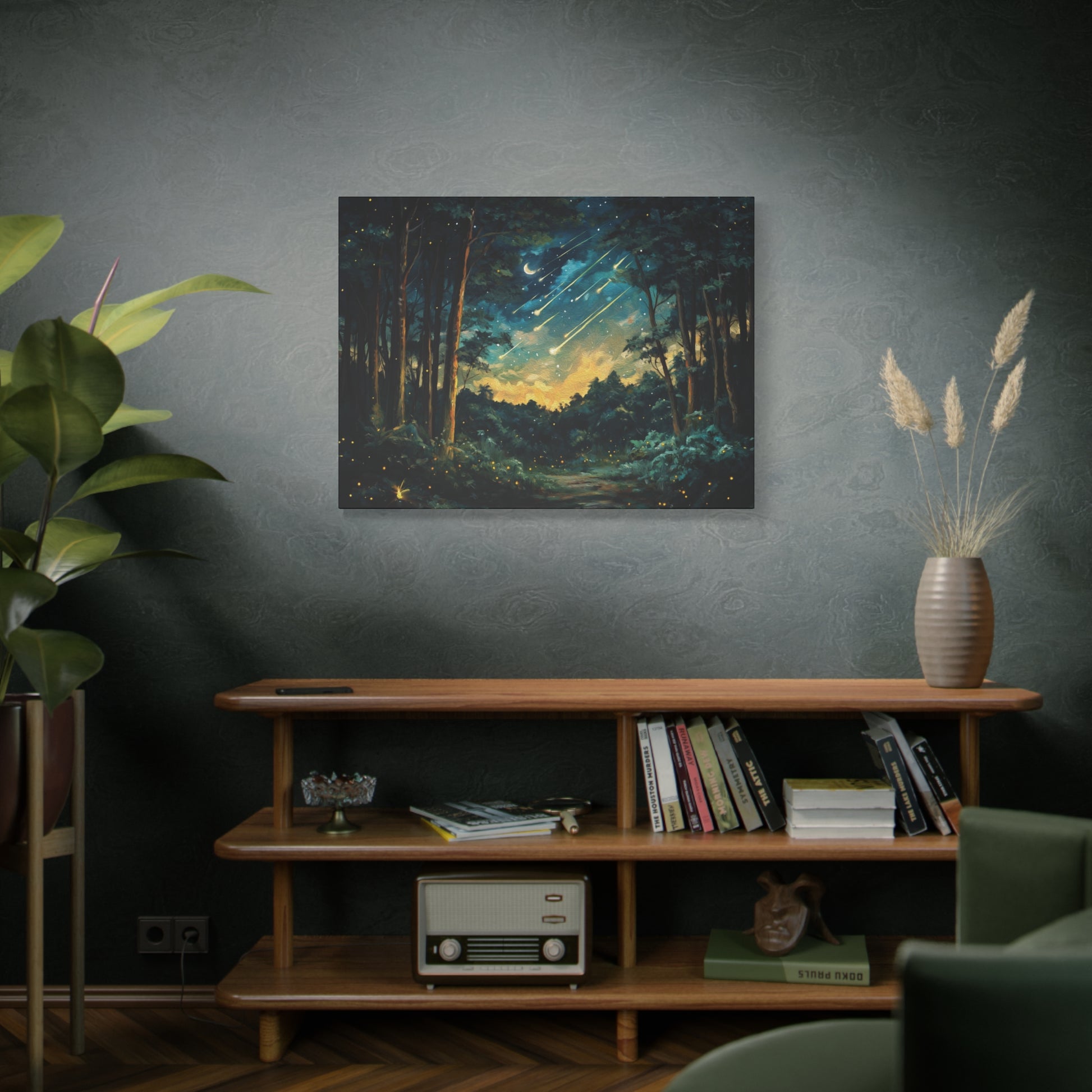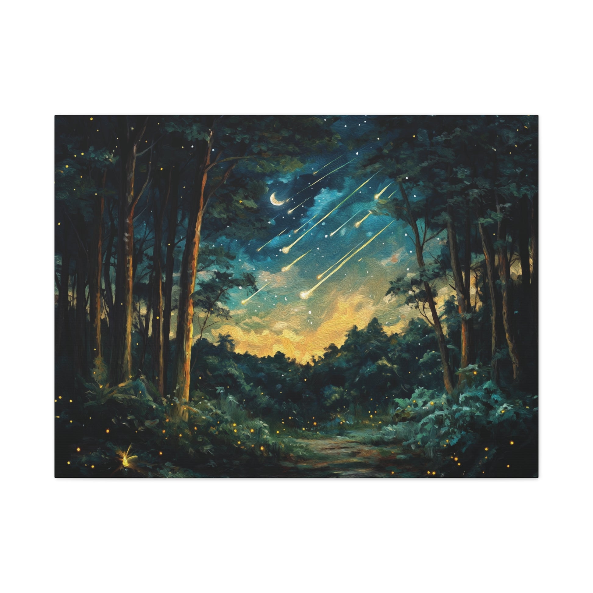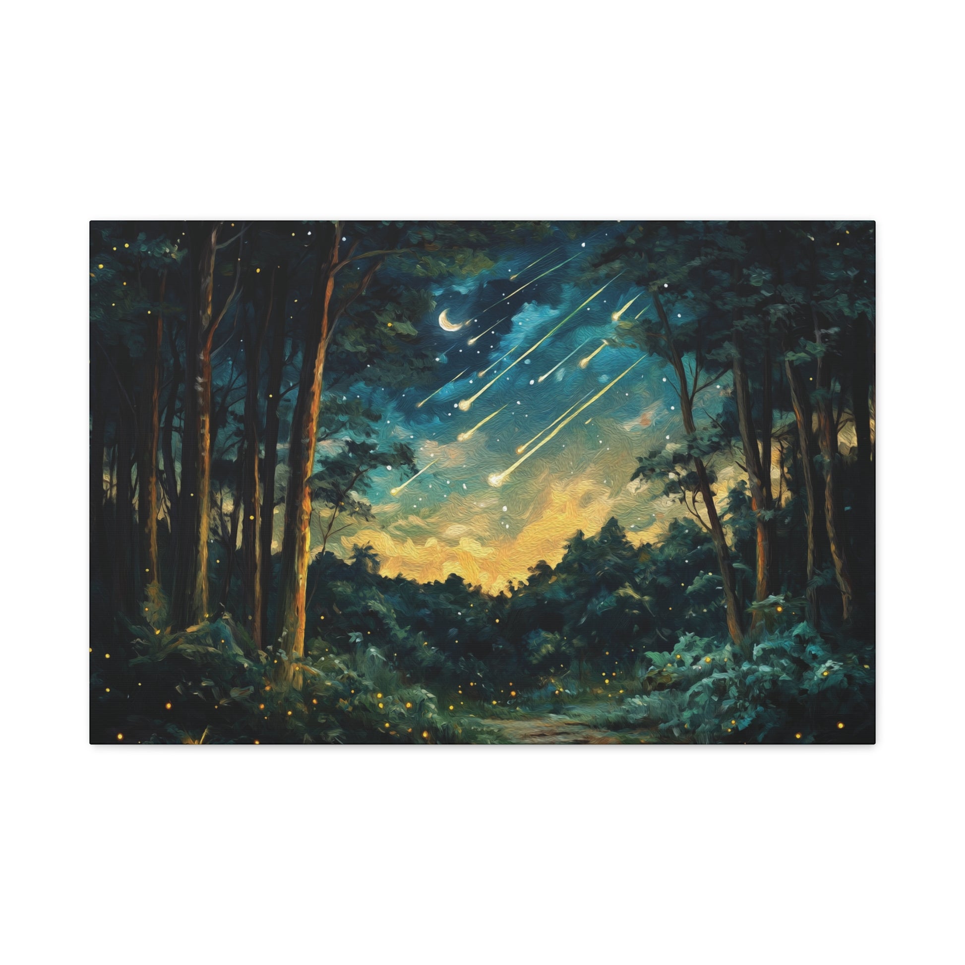 Capture a magical nighttime scene deep within the woods with this stunning canvas wall art featuring towering trees, a sky filled with golden shooting stars, a crescent moon, and dancing fireflies. Ideal for nature lovers and stargazers, this artwork brings a dreamy and peaceful atmosphere to any room. Perfect for home or office spaces.
