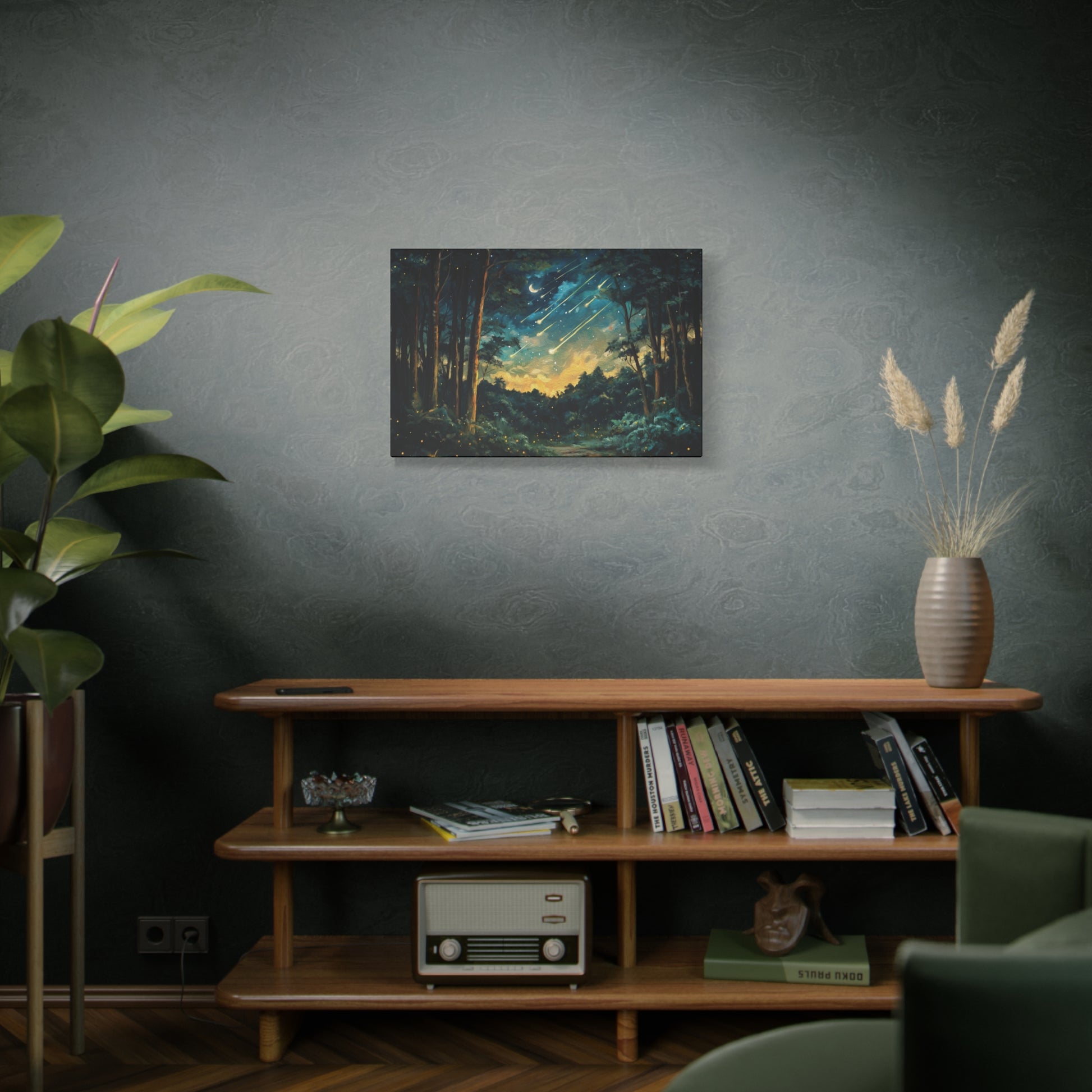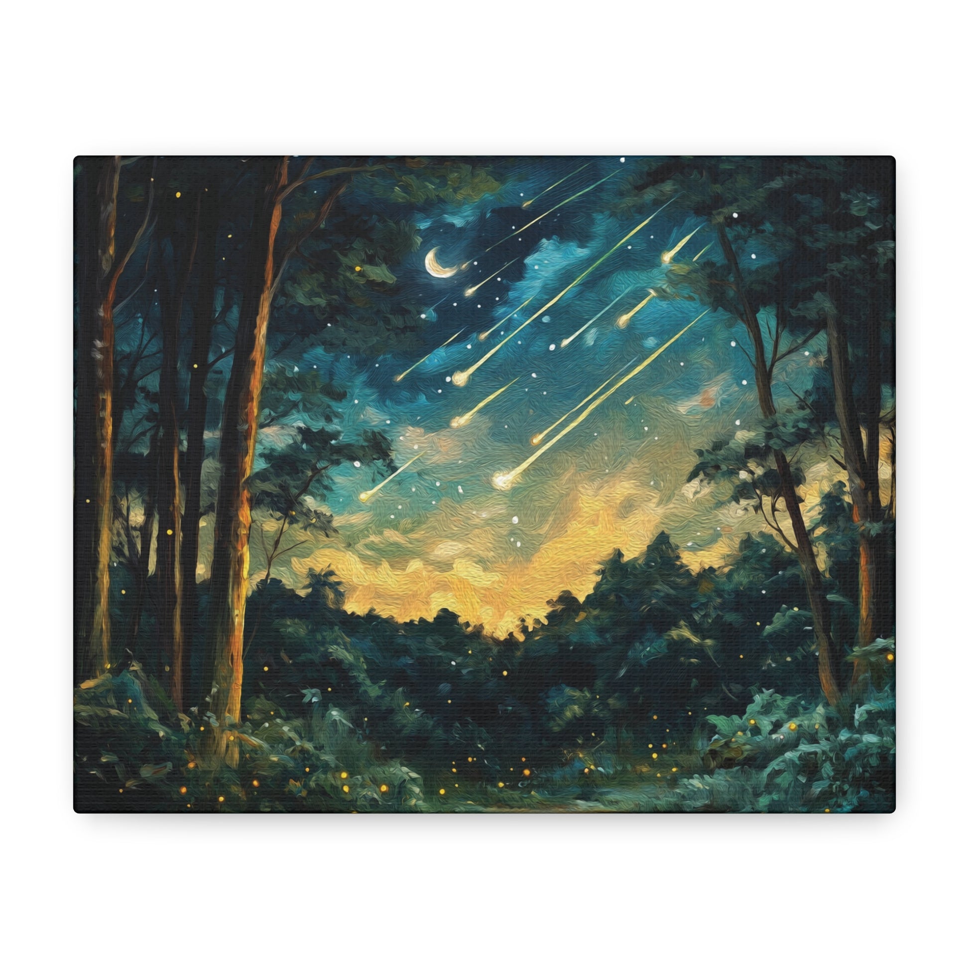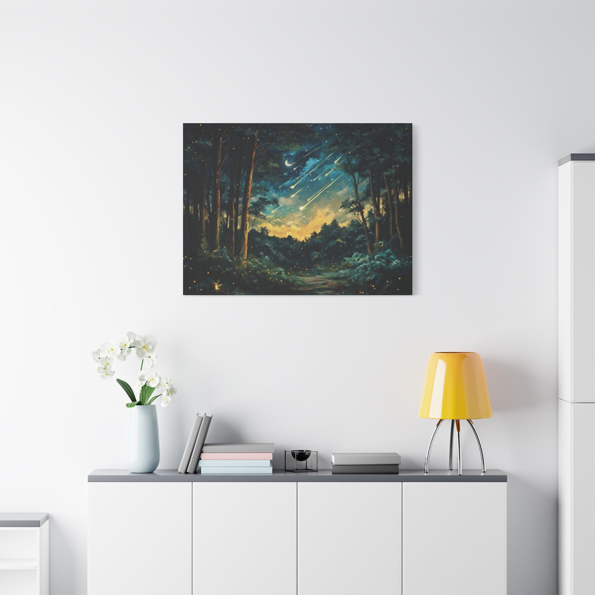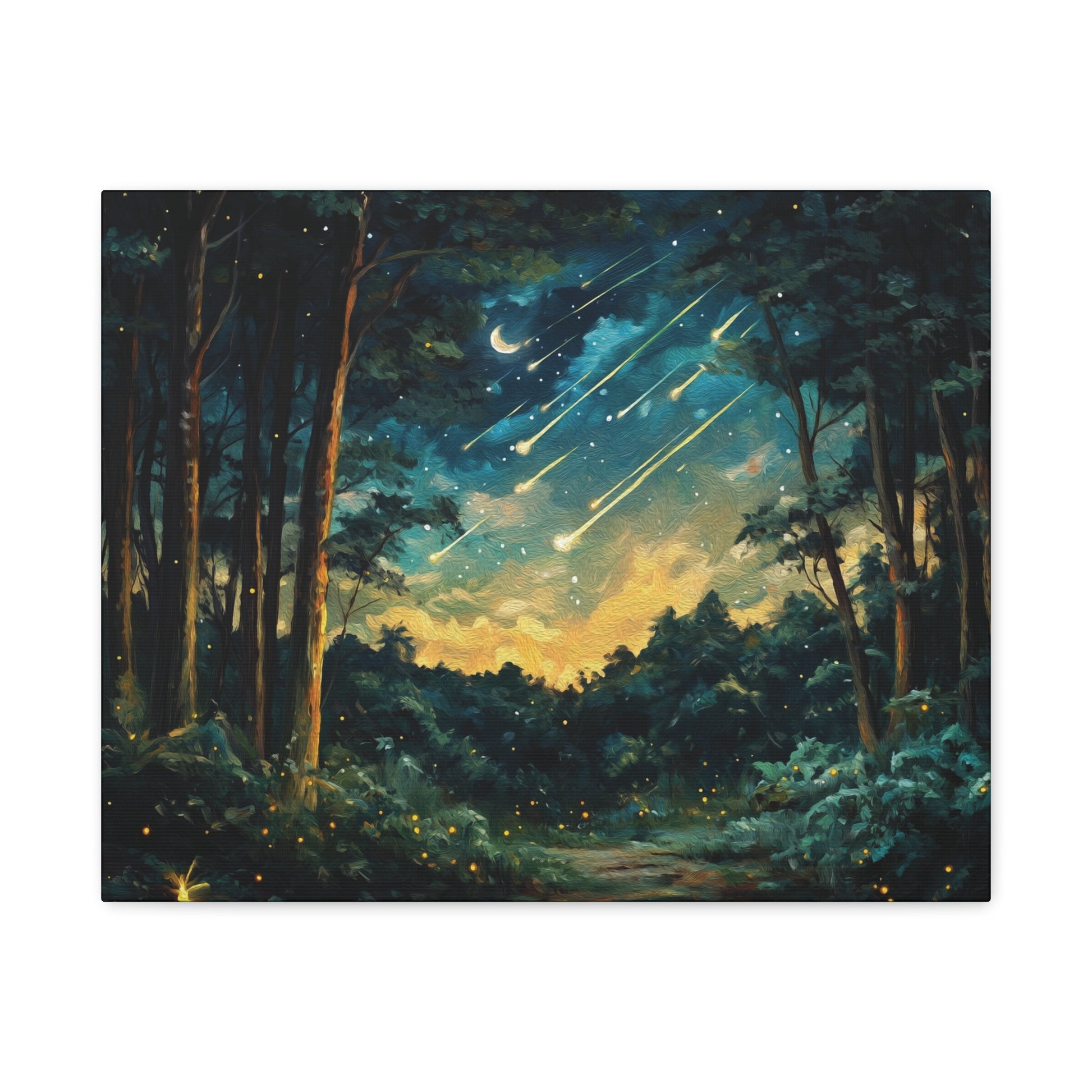 Capture a magical nighttime scene deep within the woods with this stunning canvas wall art featuring towering trees, a sky filled with golden shooting stars, a crescent moon, and dancing fireflies. Ideal for nature lovers and stargazers, this artwork brings a dreamy and peaceful atmosphere to any room. Perfect for home or office spaces.
