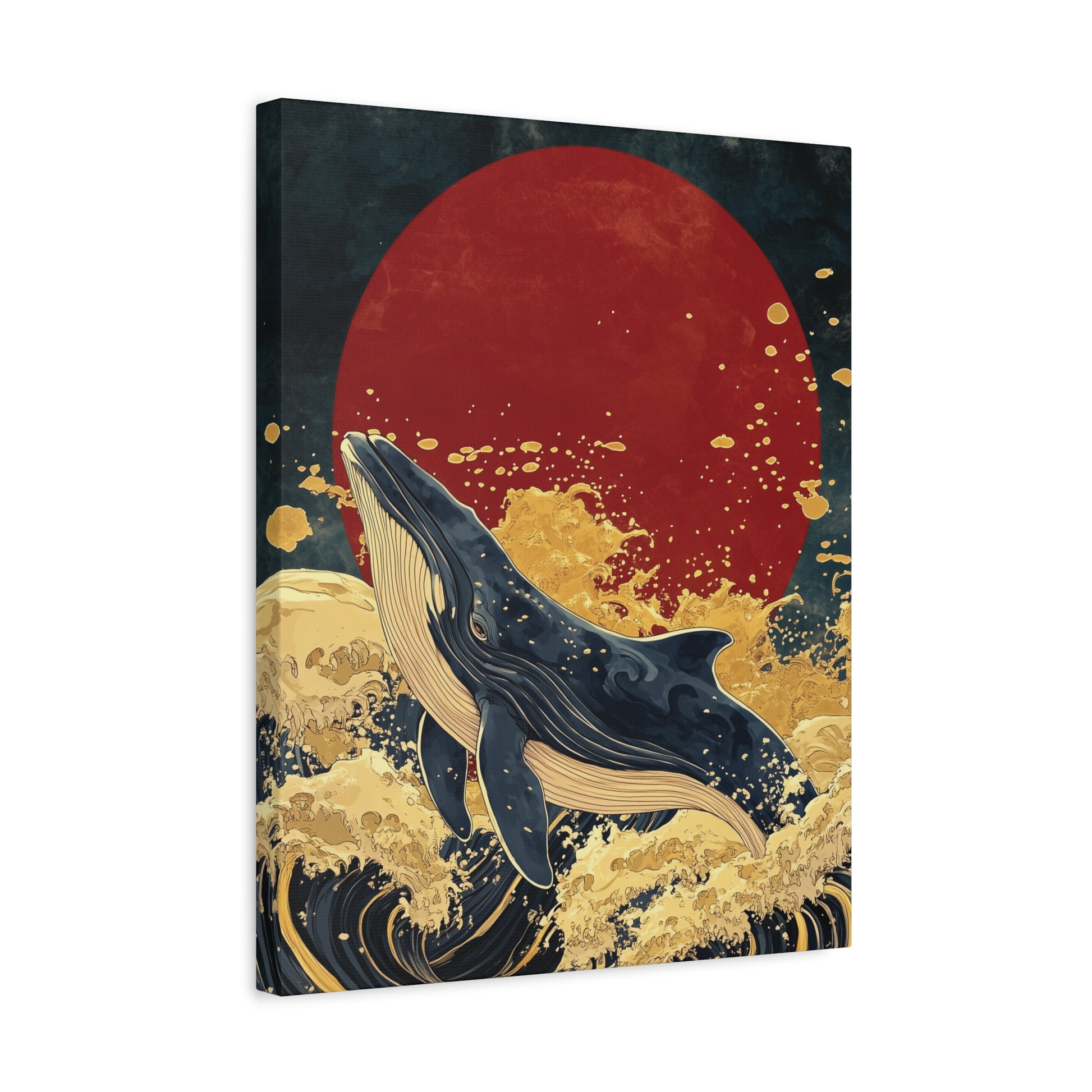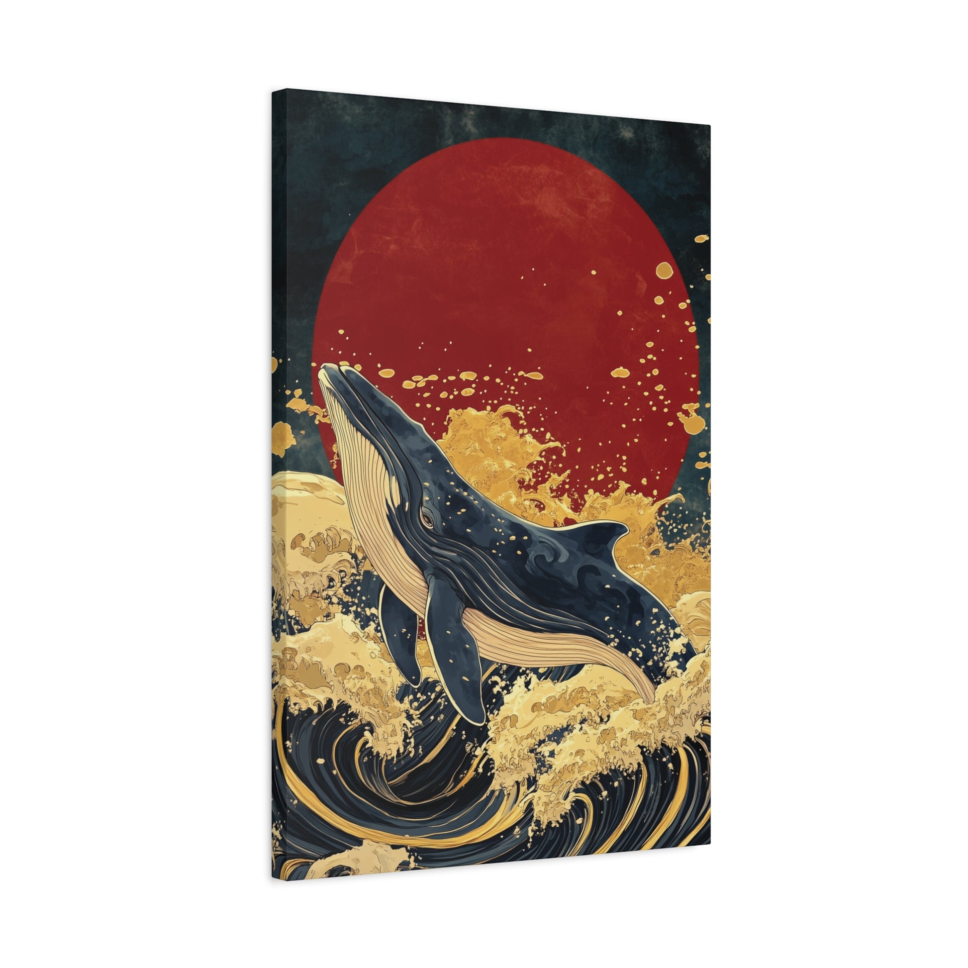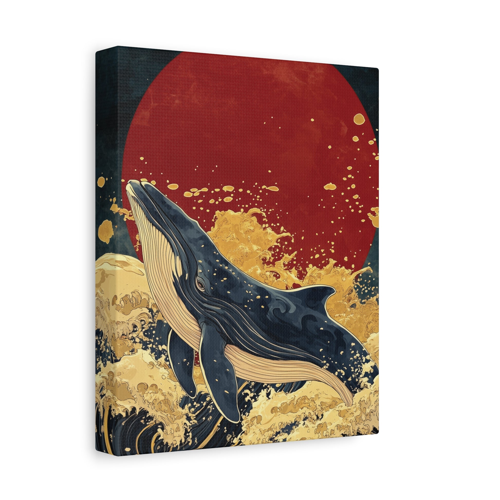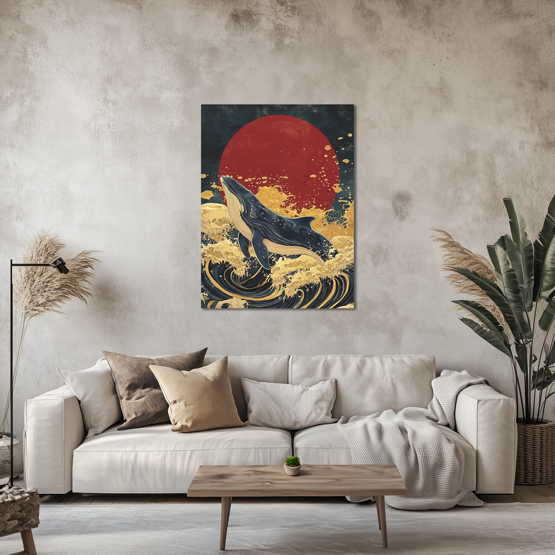 A stunning canvas print featuring a majestic whale breaching through golden waves, with a bold red sun in the background. Inspired by traditional Japanese art, this piece incorporates intricate detailing and rich colors. The deep navy blue of the whale contrasts beautifully with the background, creating a dynamic and eye-catching composition. Perfect for ocean lovers, art enthusiasts, or those looking to add elegance and movement to their space. Ideal for home decor, gifts for art lovers, or to celebrate special occasions and holidays.