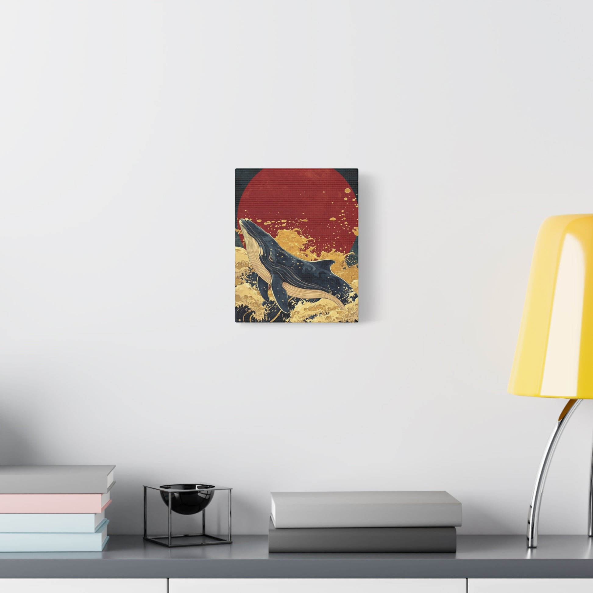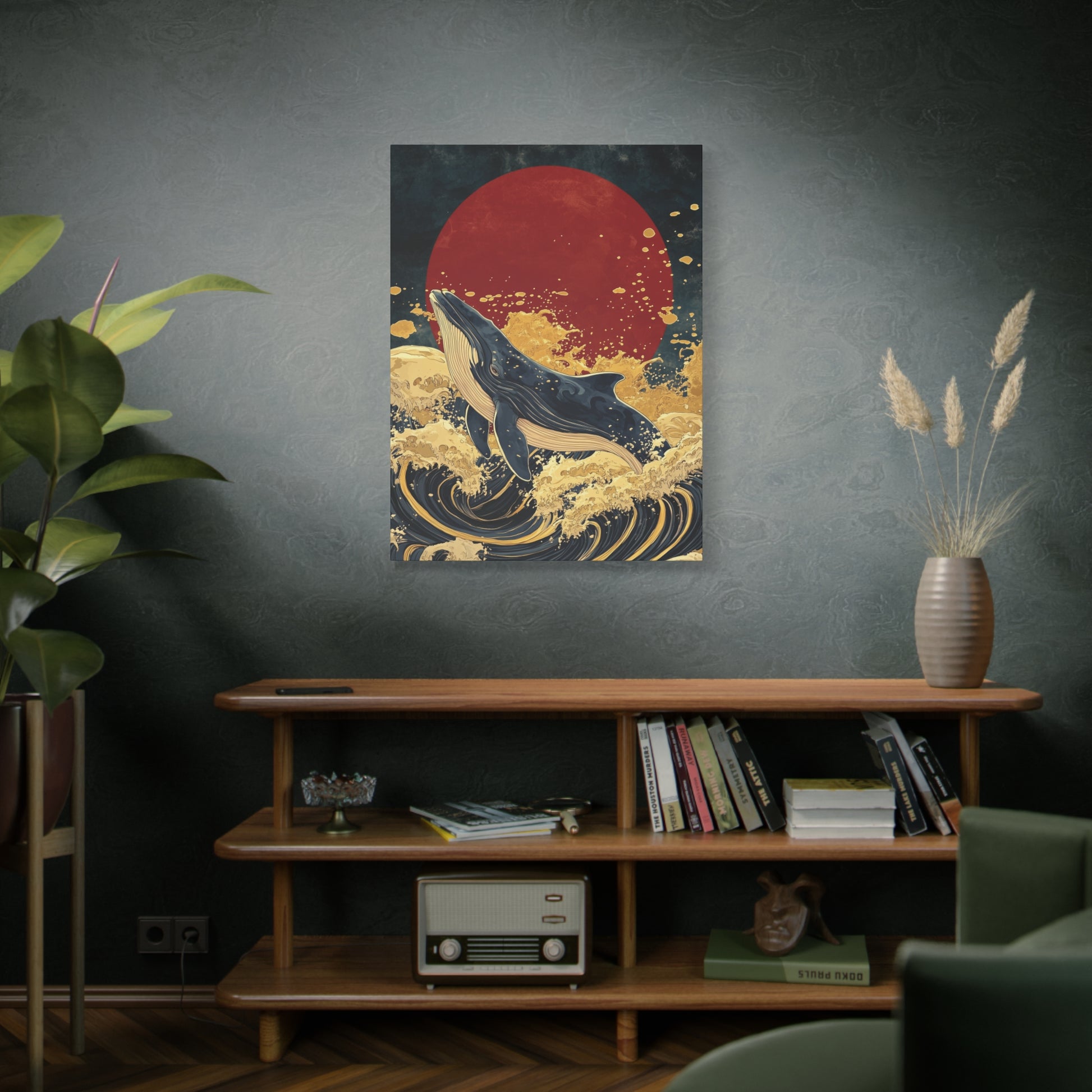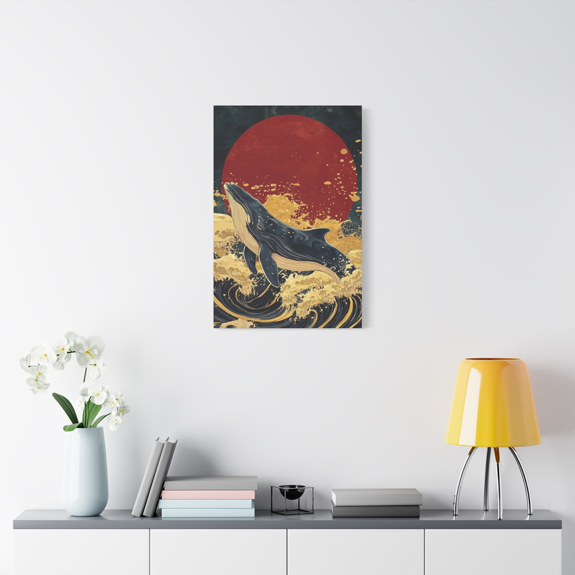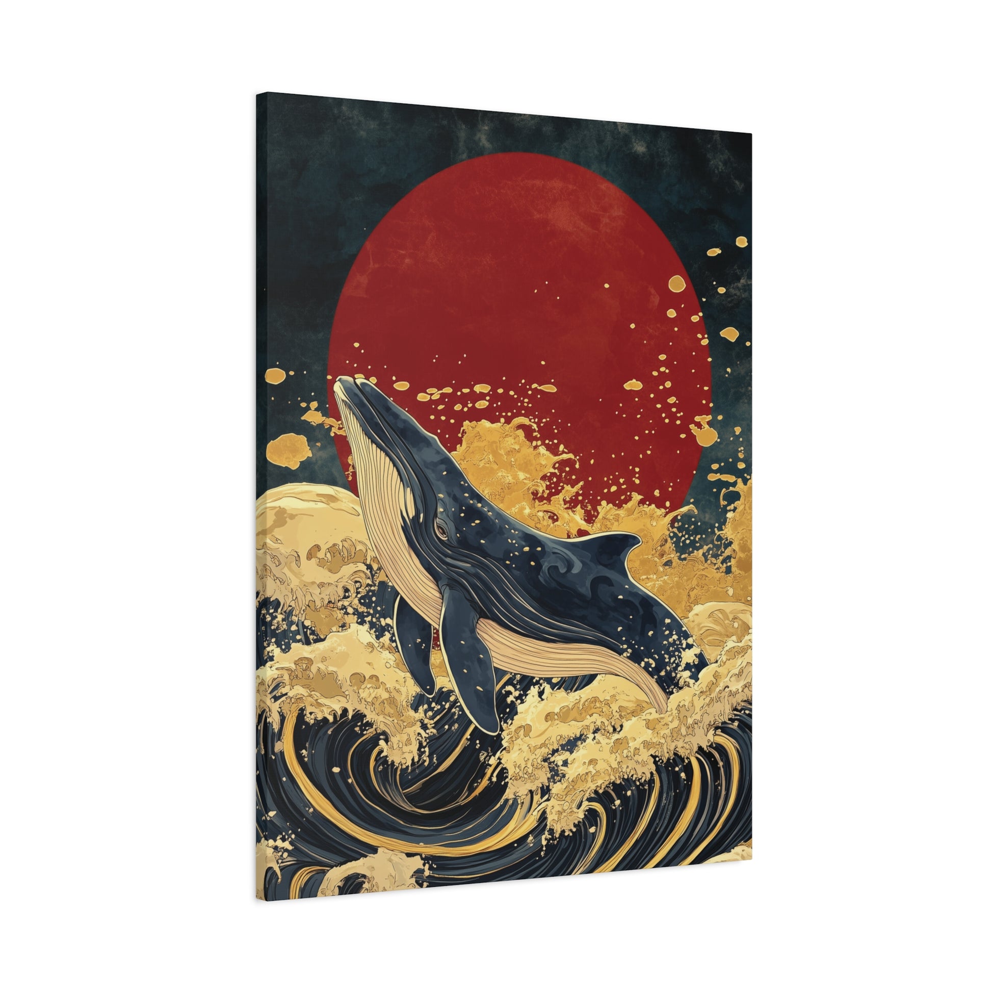 A stunning canvas print featuring a majestic whale breaching through golden waves, with a bold red sun in the background. Inspired by traditional Japanese art, this piece incorporates intricate detailing and rich colors. The deep navy blue of the whale contrasts beautifully with the background, creating a dynamic and eye-catching composition. Perfect for ocean lovers, art enthusiasts, or those looking to add elegance and movement to their space. Ideal for home decor, gifts for art lovers, or to celebrate special occasions and holidays.