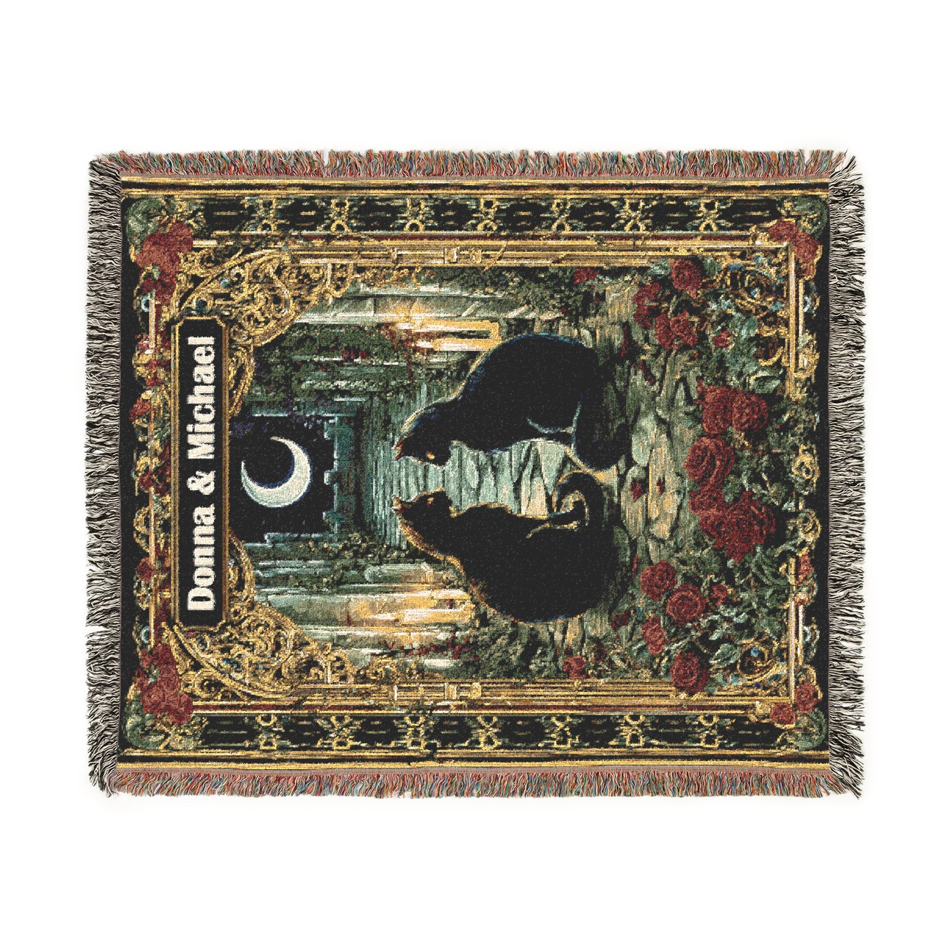 Personalized Black Cat Woven Blanket, Custom Couple Names Tapestry, Gothic Wedding Gift, Romantic Anniversary Throw, Cat Lover Home Decor