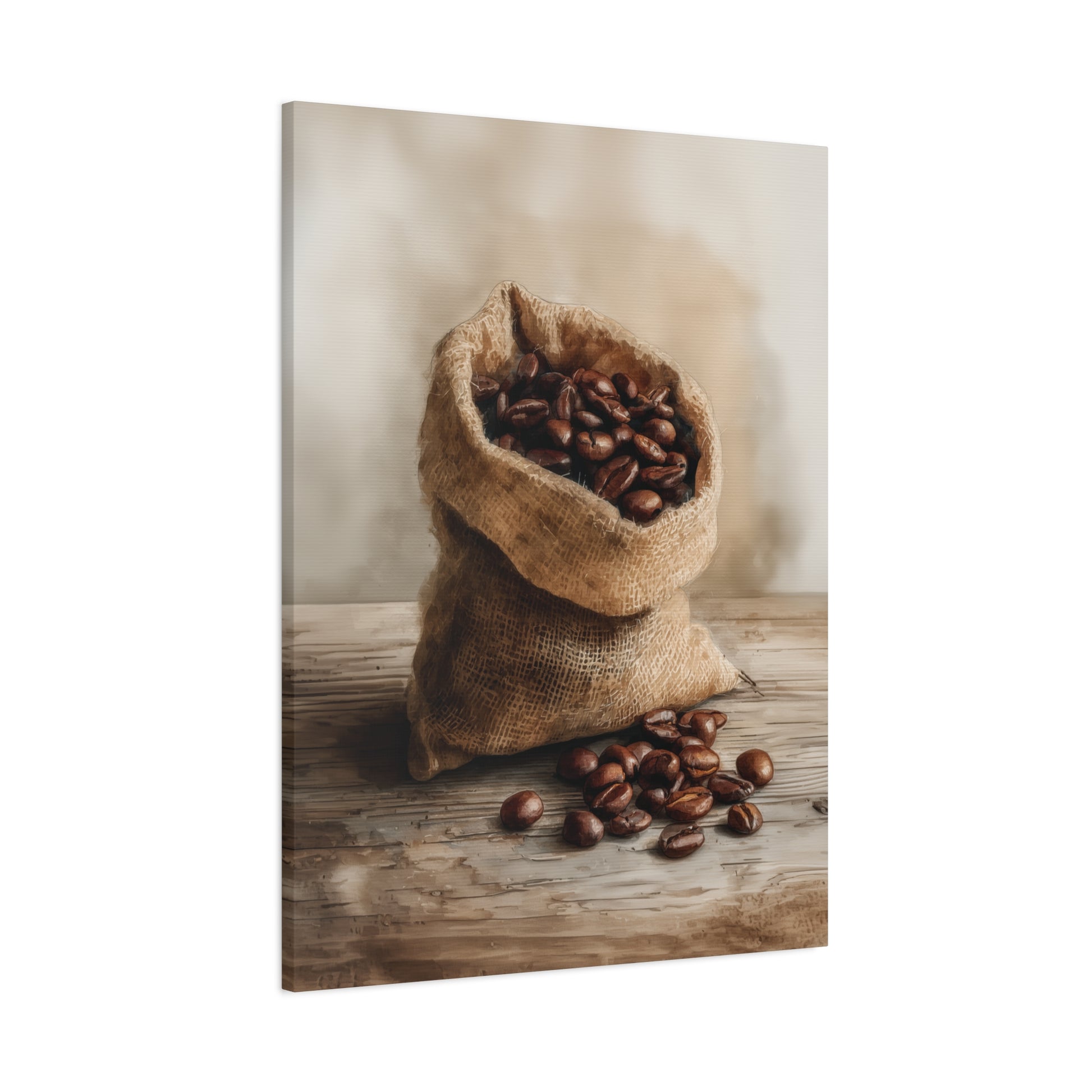 Bring the rich aroma of coffee into your home with this rustic coffee bean wall art print. Featuring a burlap sack brimming with roasted coffee beans, set against a warm wooden table, this artwork captures the cozy essence of a café in timeless style. Perfect for kitchens, dining rooms, coffee nooks, or cafés, this piece adds warmth and charm to any space.
