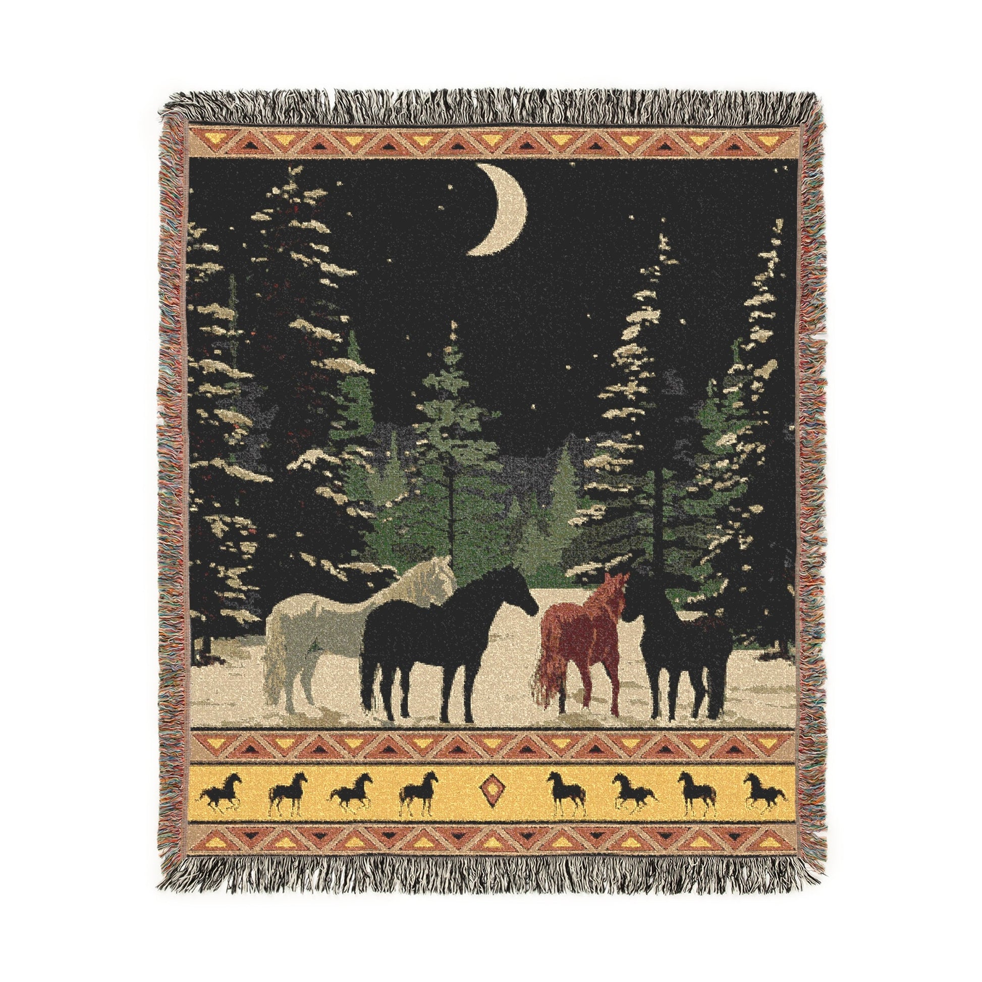 Southwestern Horse Woven Blanket, Winter Scene Tapestry, Rustic Cabin Decor Jacquard Throw, Western Equestrian Snowy Moonlit Forest Art