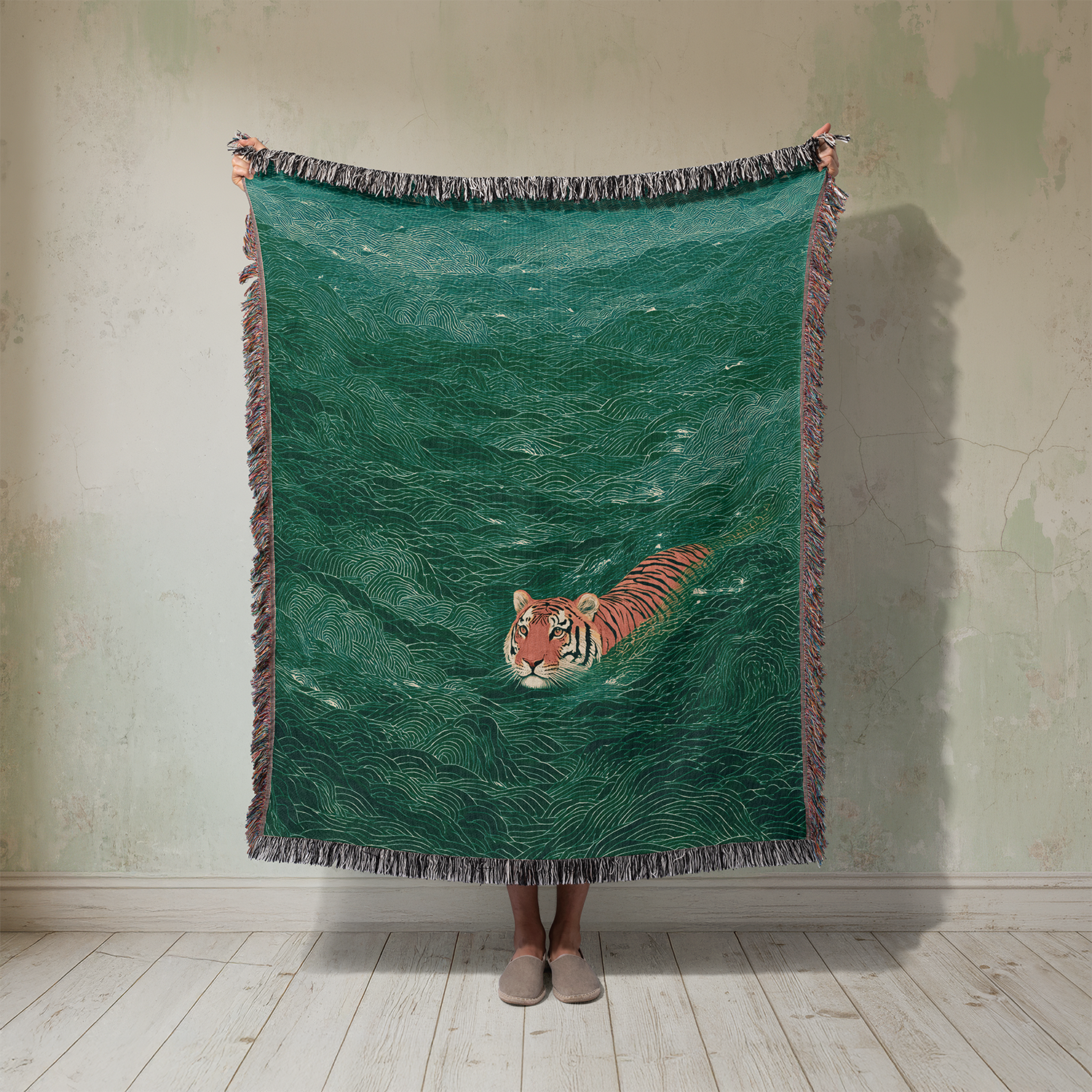 Swimming Tiger Woven Blanket, Japanese Painting Style Tapestry, Coastal Art Jacquard Throw, Asian Animal Wall Hanging, Zen Decor Gift