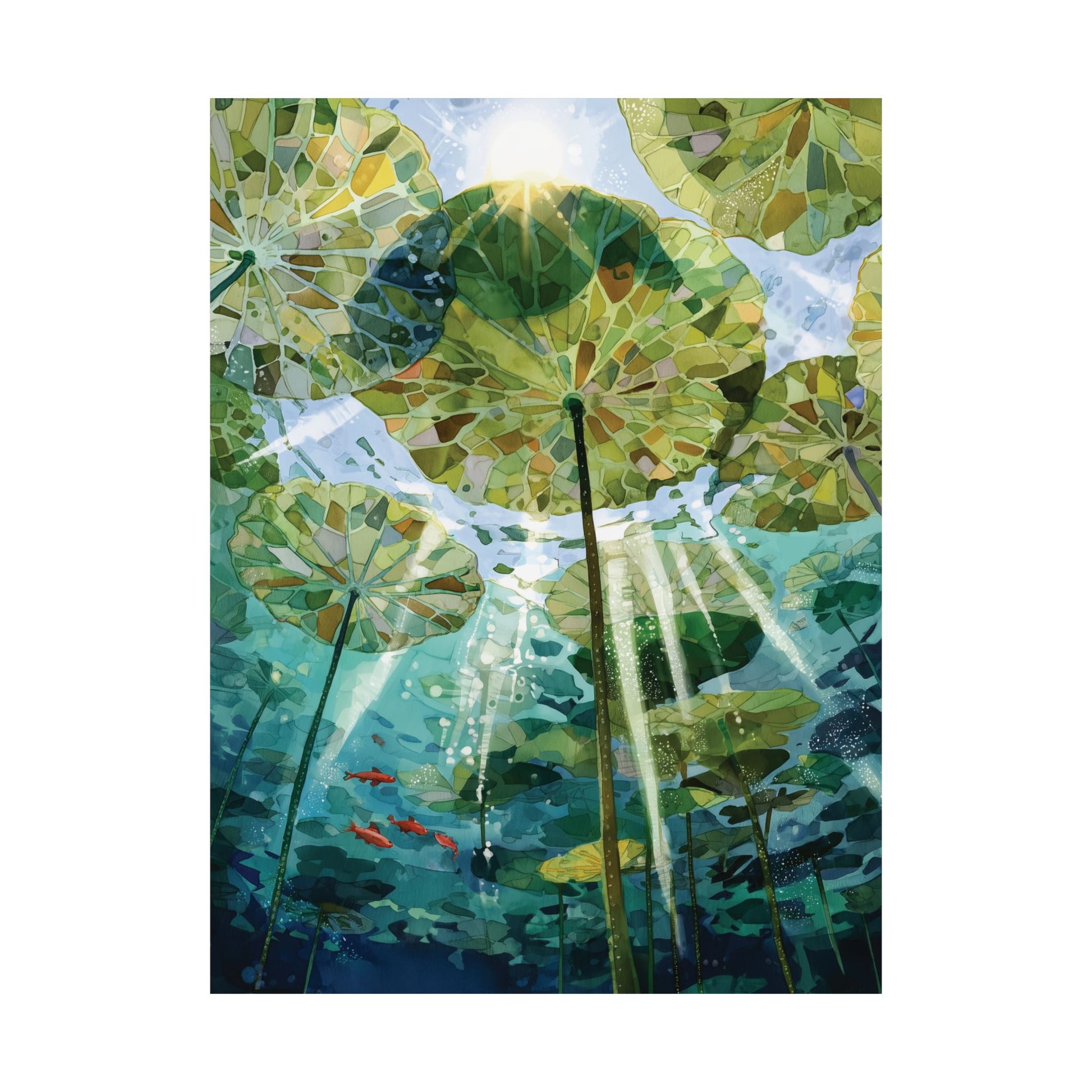 Bring the beauty of nature into your home with this stunning underwater lily pond artwork. Featuring sunlight streaming through large mosaic-like lily pads with graceful fish swimming below, this piece captures the peaceful magic of looking up from beneath the water. The vibrant greens, blues, and golden rays create a sense of calm and wonder—perfect for any nature lover, meditation space, or modern home décor. Available as a canvas print or poster, it makes a beautiful statement piece and a thoughtful gift for art lovers.