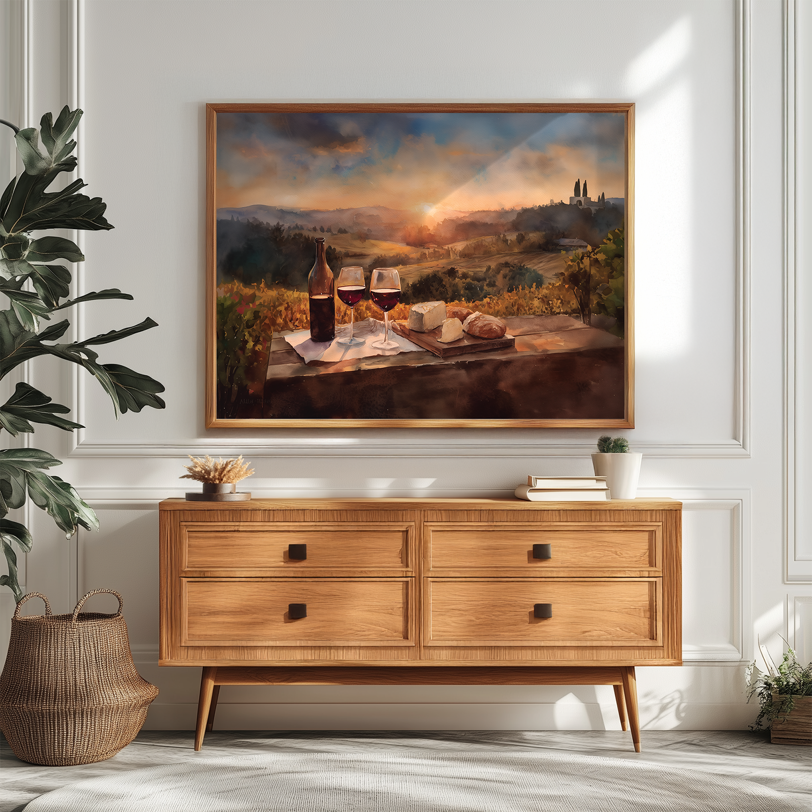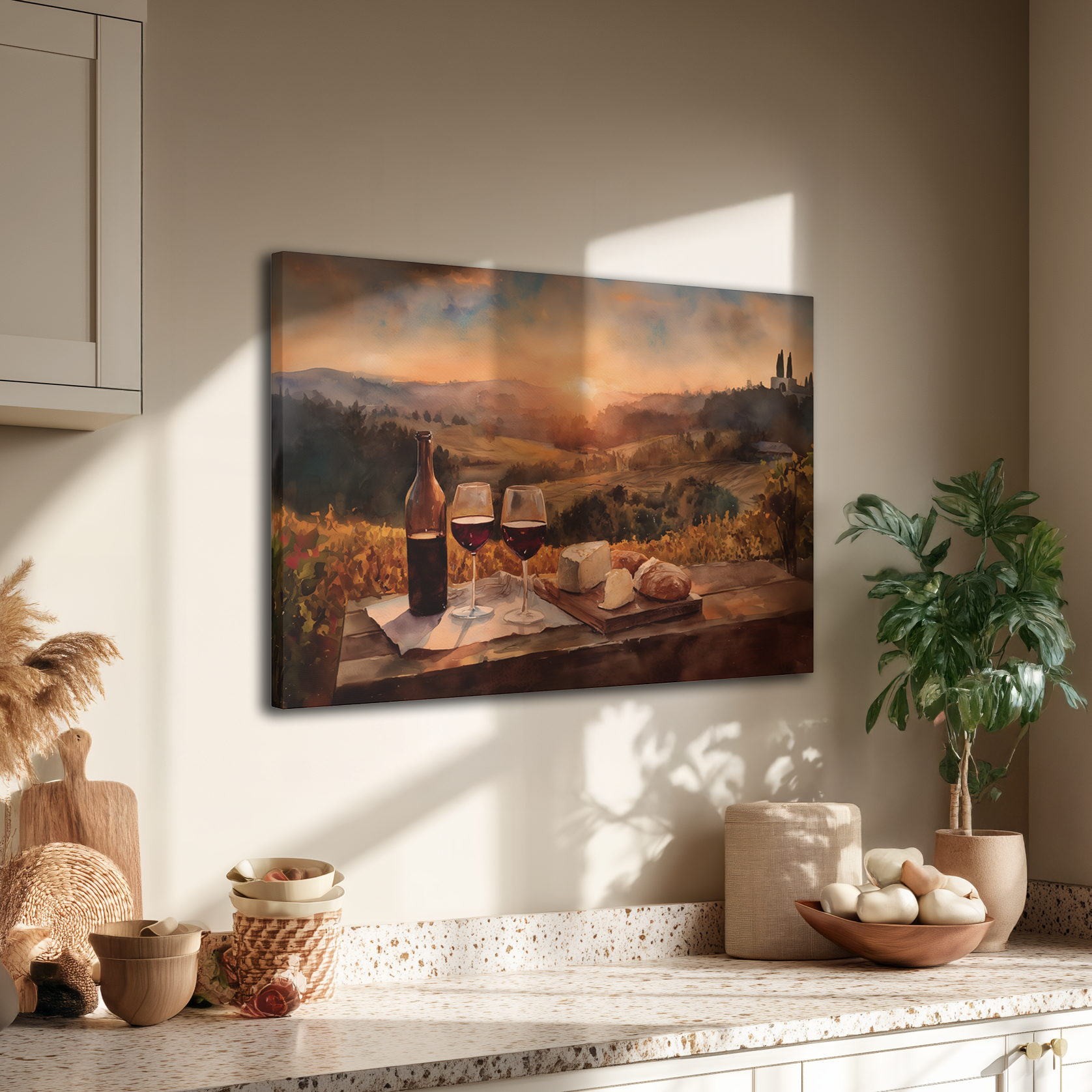 Bring the warmth of Tuscany into your home with this beautiful wall art featuring a romantic vineyard sunset. The artwork showcases a serene countryside view with rolling hills, a glowing golden sky, and a cozy picnic setting of wine, cheese, and bread. The rich colors and painterly style capture the charm of Italian wine country, making it perfect for kitchens, dining rooms, wine cellars, or cozy living spaces. Available as a high-quality canvas or poster print, this piece adds a touch of rustic elegance and European charm to any home decor.