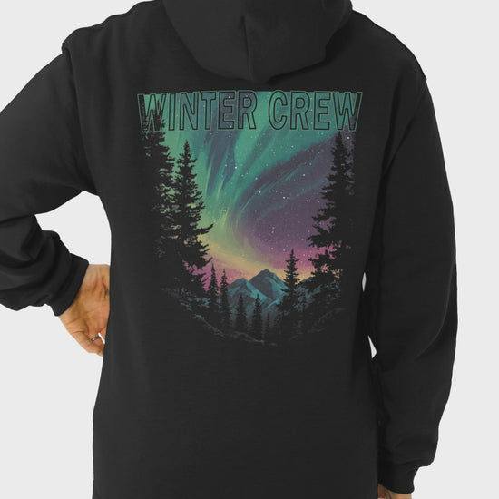 This black pullover hoodie features a vibrant winter-night design of a mountain peak surrounded by tall pine trees under an aurora borealis. Perfect for cozy evenings, stargazing adventures, or showing love for crisp winter nights and the magic of the northern lights. Suitable for anyone who enjoy wintery vibes and outdoor activities, great for winter holidays and stargazing nights.