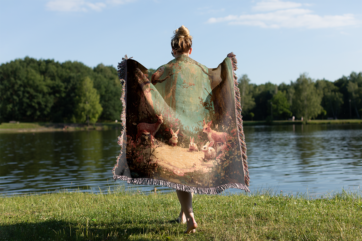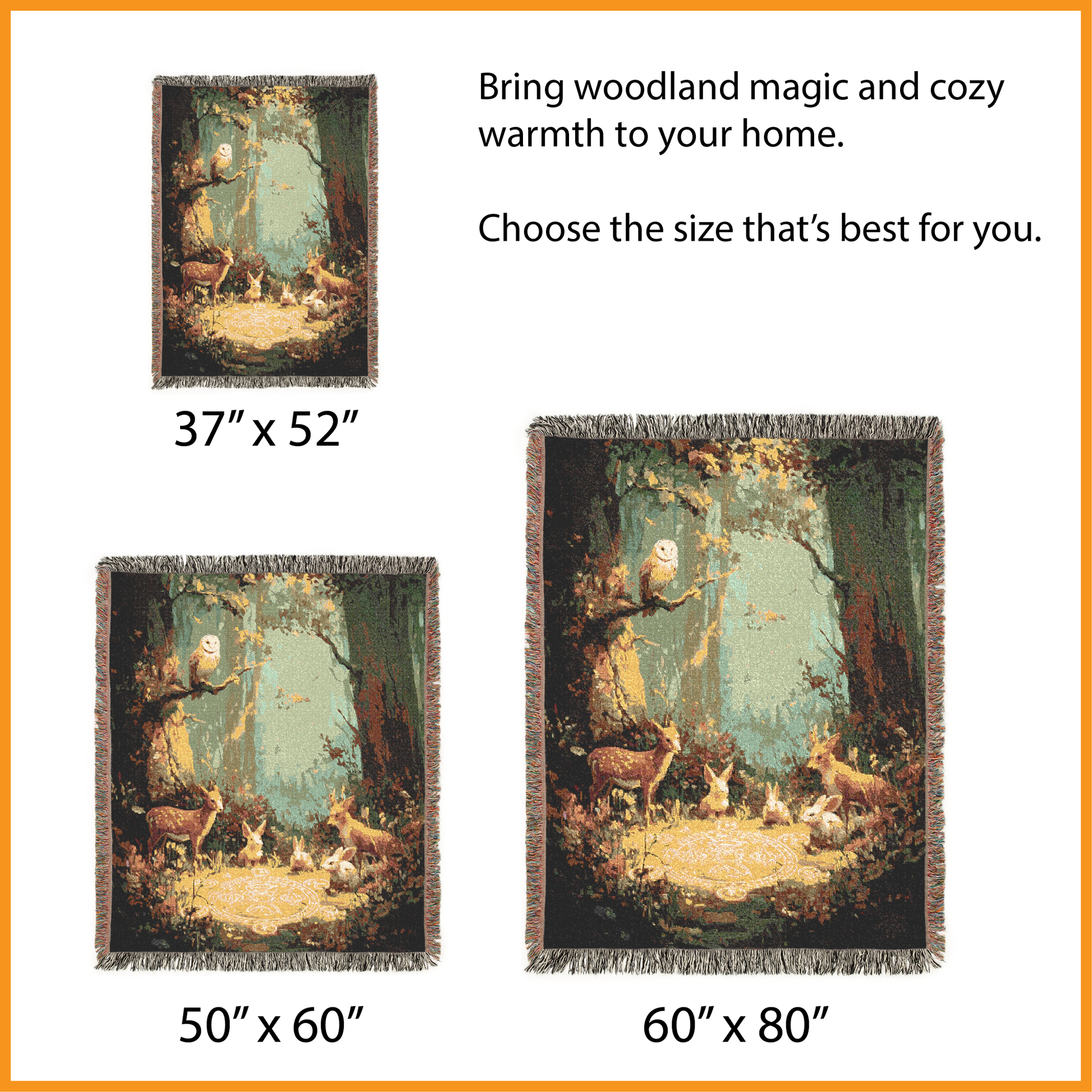 This cozy woven blanket showcases a storybook woodland scene with deer, rabbits, and an owl in a sunlit forest clearing. Rich earthy tones of green, amber, and gold give it a warm, magical glow. Perfect as a throw for your sofa or bed, it doubles as eye-catching wall decor for nature and rustic charm lovers.